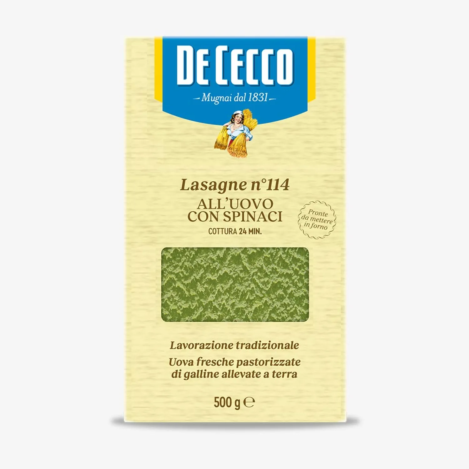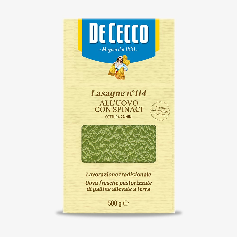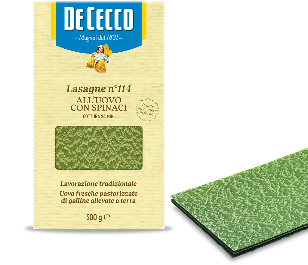 De Cecco Lasagne n°114 all’uovo con spinaci sú skutočným potešením pre zmysly – jemne vaječné cestovinové pláty s prídavkom špenátu, ktoré nielen krásne vyzerajú, ale predovšetkým vynikajú výnimočnou chuťou a kvalitou.