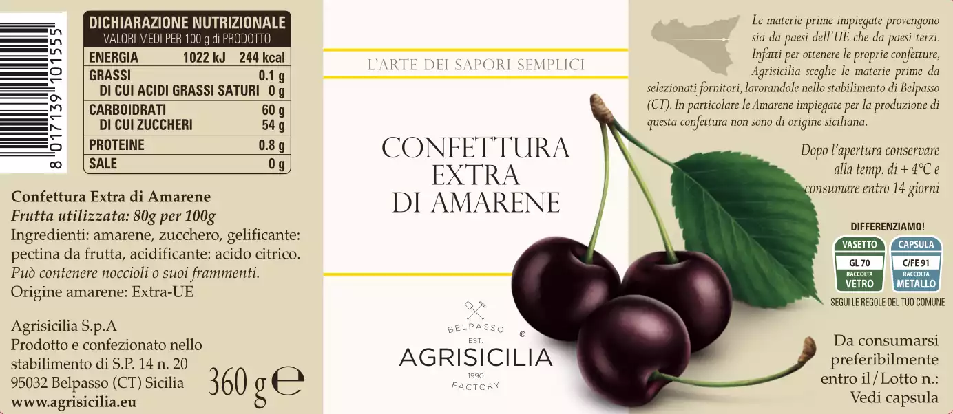 Talianska spoločnosť Agrisicilia sa zameriava na zachovanie tradičných chutí a ponúka autentický zážitok priamo z bohatej sicílskej pôdy. Pri výrobe tohto džemu sa používajú čerešne odrody Amarene, ktoré zaručujú jeho nezameniteľnú chuť a kvalitu.