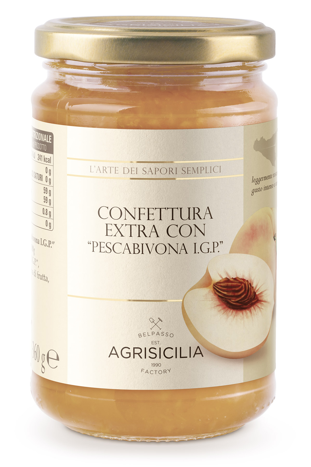 Predstavujeme Vám džem zo sicílskych broskýň odrody Pescabivona I.G.P. od spoločnosti Agrisicilia, ktorý charakterizuje lahodne jemná chuť a intenzívna vôňa. Broskyne Pescabivona I.G.P.  patria do panorámy sicílskej poľnohospodárskej excelentnosti. Pestujú sa v niektorých oblastiach provincie Agrigento, ale aj v obci v provincii Palermo. Broskyne vynikajú charakteristickou bielou dužinou, ktorá na podnebí uvoľňuje veľmi sladkú a zamatovú chuť.
