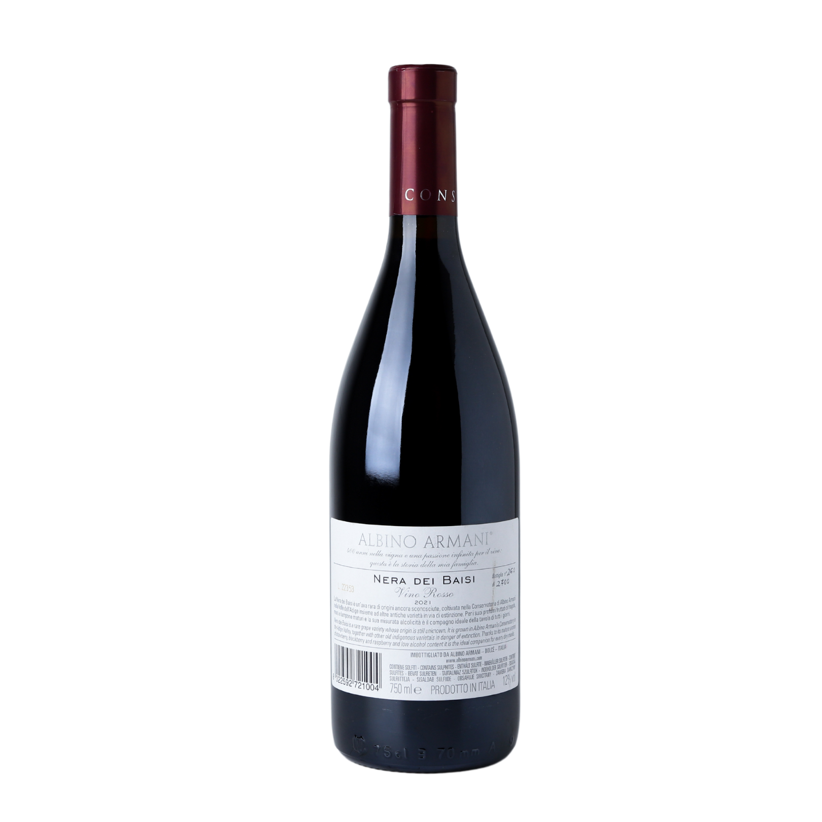Červené suché víno NERA DEI BAISI DOC (s kontrolovaným označením pôvodu) od ALBINO ARMANI patrí k najexkluzívnejším vínam tejto vinice. Dôvod je prostý – vyrába sa z takmer vyhynutej rovnomennej a pôvodnej odrody regiónu, prežívajúcej už len na niekoľkých malých viniciach. Ide o hrozno s aromaticky silným profilom a skoro zabudnutú perlu vinárstva. Hrozno sa zberá ručne, macerácia prebieha spolu so šupkami, kým fermentácia v tankoch z nerezovej ocele. Víno zreje striedavo v oceli a striedavo v dreve, a napokon vo fľaši. Veľmi radi by sme Vám priblížili presnejšiu prípravu a výrobu tohto vína, ale vinárstvo ALBINO ARMANI si bližšie informácie prísne stráži.