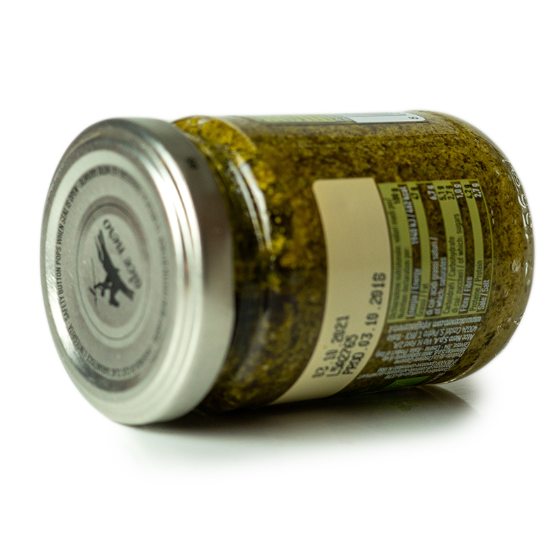 Zloženie: prípravok na báze bazalky (46%) (bazalka 41% v hotovom výrobku, slnečnicový olej, soľ), slnečnicový olej, extra panenský olivový olej, kešu oriešky, syr Parmigiano Reggiano DOP (2,5%) (kravské mlieko, soľ, syridlo), syr pecorino (ovčie mliekosyridlo, soľ), soľ, píniové oriešky (0,9%), cesnak.