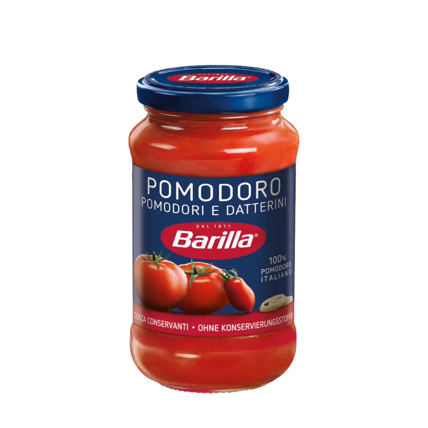 Barilla omáčka s paradajkami Datterini je hotová paradajková omáčka postavená na kombinácii paradajkovej dužiny a pretlaku, doplnená o paradajky odrody Datterini, ktoré sú známe jemnejšou a prirodzene sladšou chuťou. Omáčka má čistý paradajkový charakter s miernou sladkosťou, bez potreby ďalšieho dochucovania, a je určená na okamžité použitie po zahriatí.