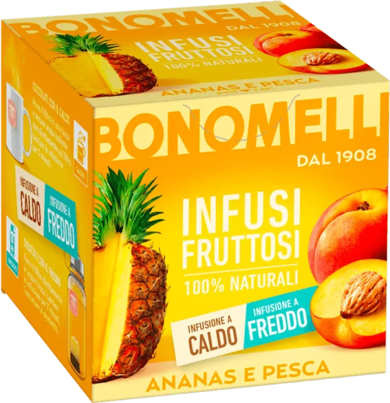 Ideálny je teplý počas chladných dní alebo ako osviežujúci ľadový nápoj v lete. Bonomelli ananás a broskyňa – jemne sladká kombinácia, ktorá do vašej šálky prinesie vôňu talianskeho slnka a chuť pohody.