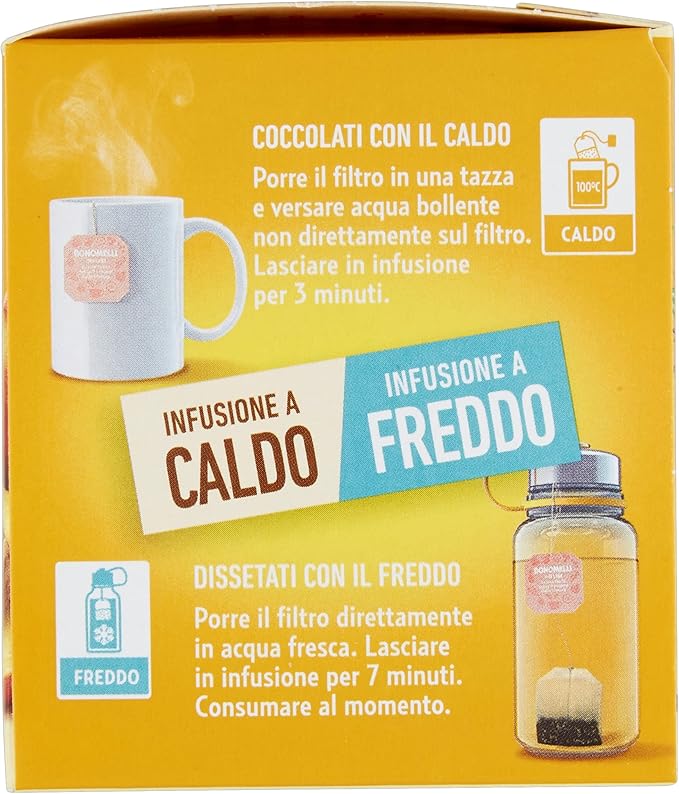 Značka Bonomelli patrí k najobľúbenejším talianskym producentom čajov a bylinkových nápojov. Už viac než sto rokov spája tradíciu s kvalitou a ponúka čaje, ktoré potešia svojou vyváženou chuťou aj prirodzenou arómou. Tento ovocný čaj je vyrobený z výberových sušených kúskov ovocia bez umelých prísad – len čistá esencia prírody, ktorú cítiť v každom dúšku.