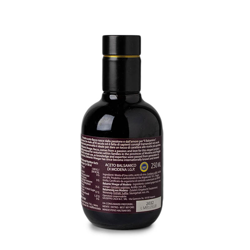 Zažite jedinečnú chuť Bacco Aceto Balsamico di Modena I.G.P. Tento prémiový balzamikový ocot je vyrobený z najkvalitnejšieho hrozna a dokonale zreje v dubových sudoch, výsledkom čoho je bohatá, sladká a kyslá chuť. Či už ste gurmánsky šéfkuchár alebo jednoducho chcete pridať do svojho varenia nádych sofistikovanosti tak, Bacco Aceto Balsamico di Modena I.G.P. je pre Vás ideálnou ingredienciou. Je ideálny na šaláty, grilované mäso, ryby, ale aj na ovocné dezerty.