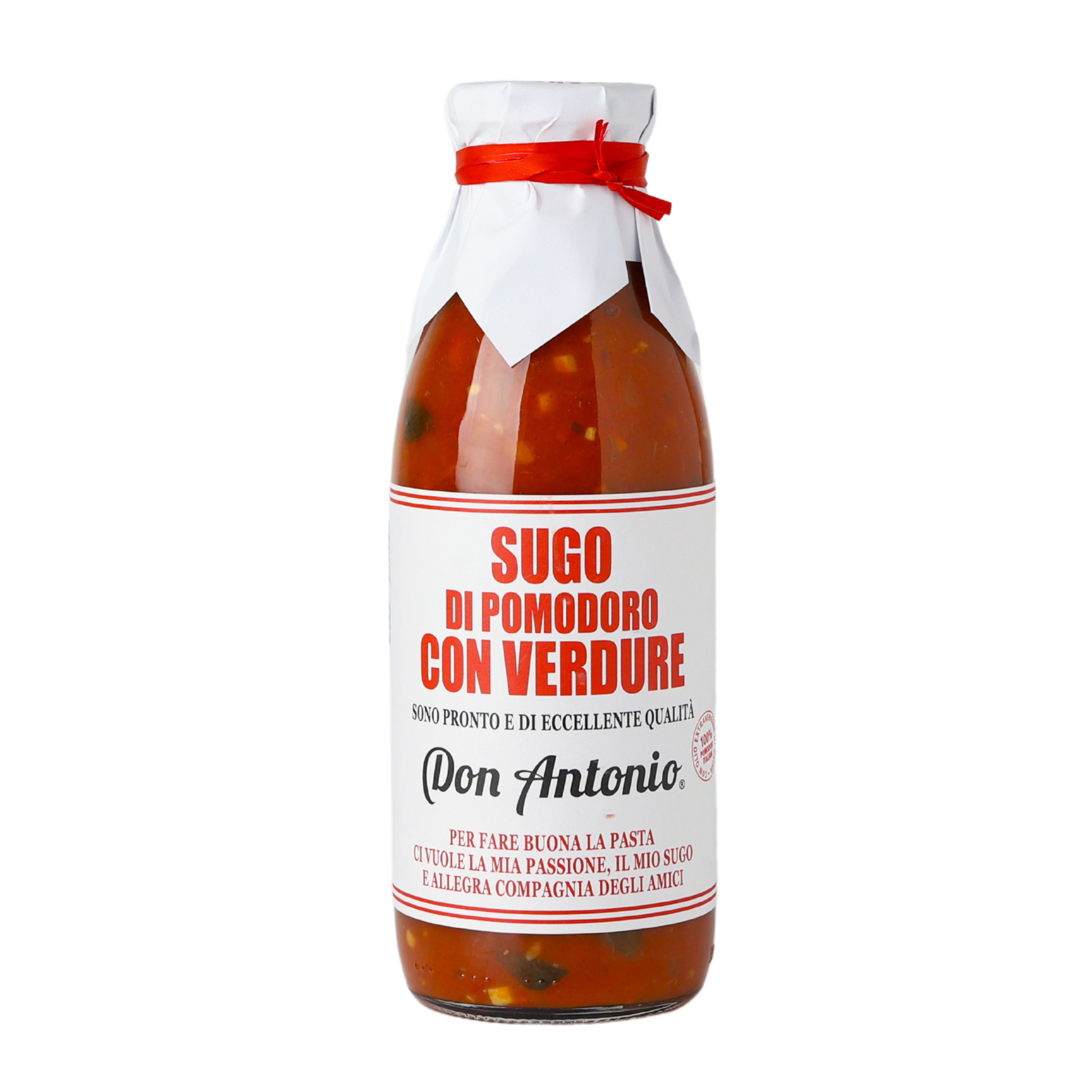 Zloženie: Paradajka 67,5% (paradajková dužina, pyré z cherry paradajok), zelenina 27,3% (červená a žltá paprika, baklažán, cuketa, cibuľa), extra panenský olivový olej, cesnak, soľ, petržlen, oreganočierna paprika, regulátor kyslosti: kyselina citrónová. Môže obsahovať stopy mlieka a zeleru.
