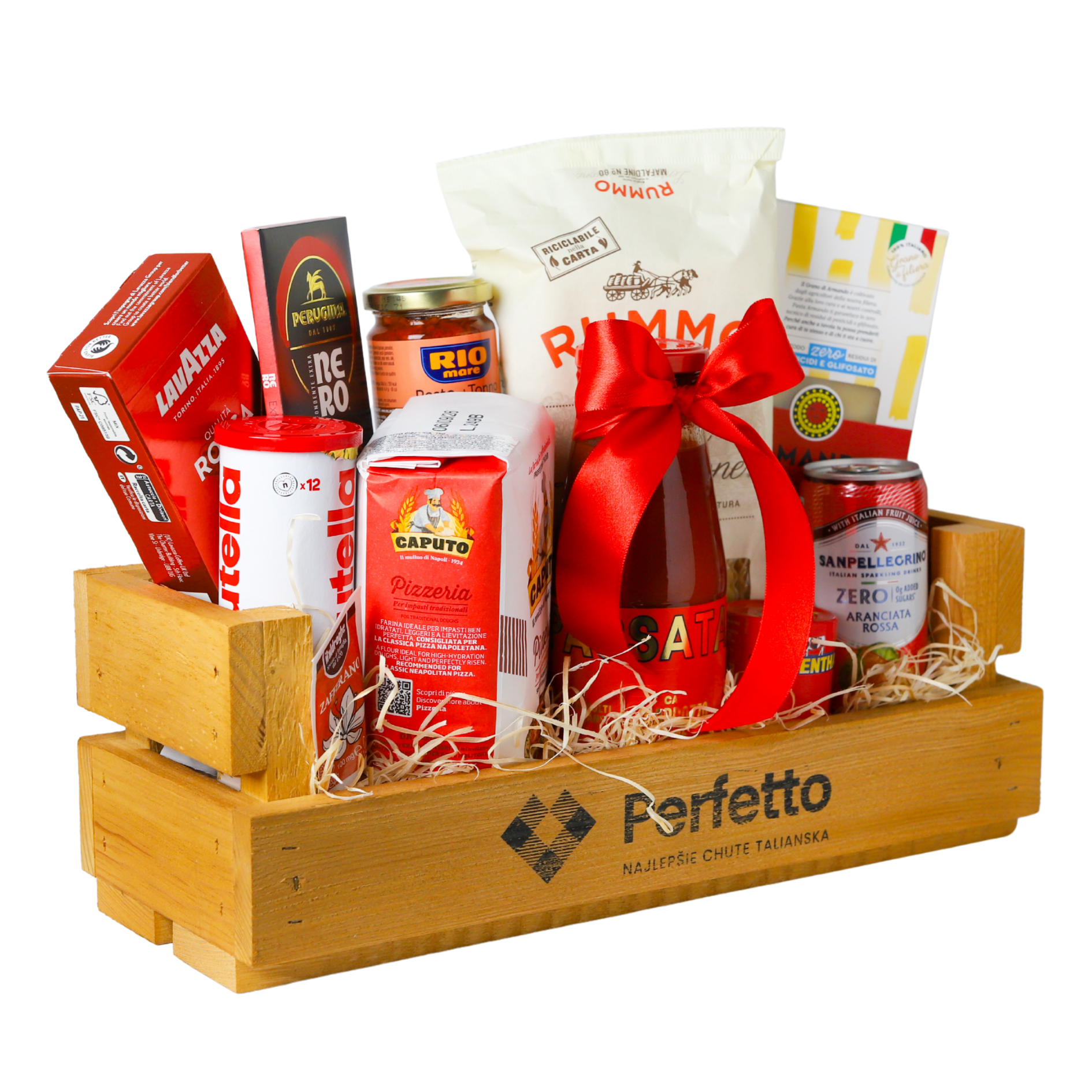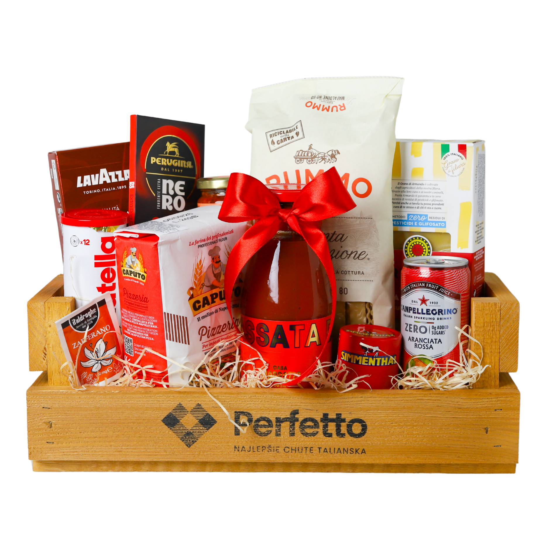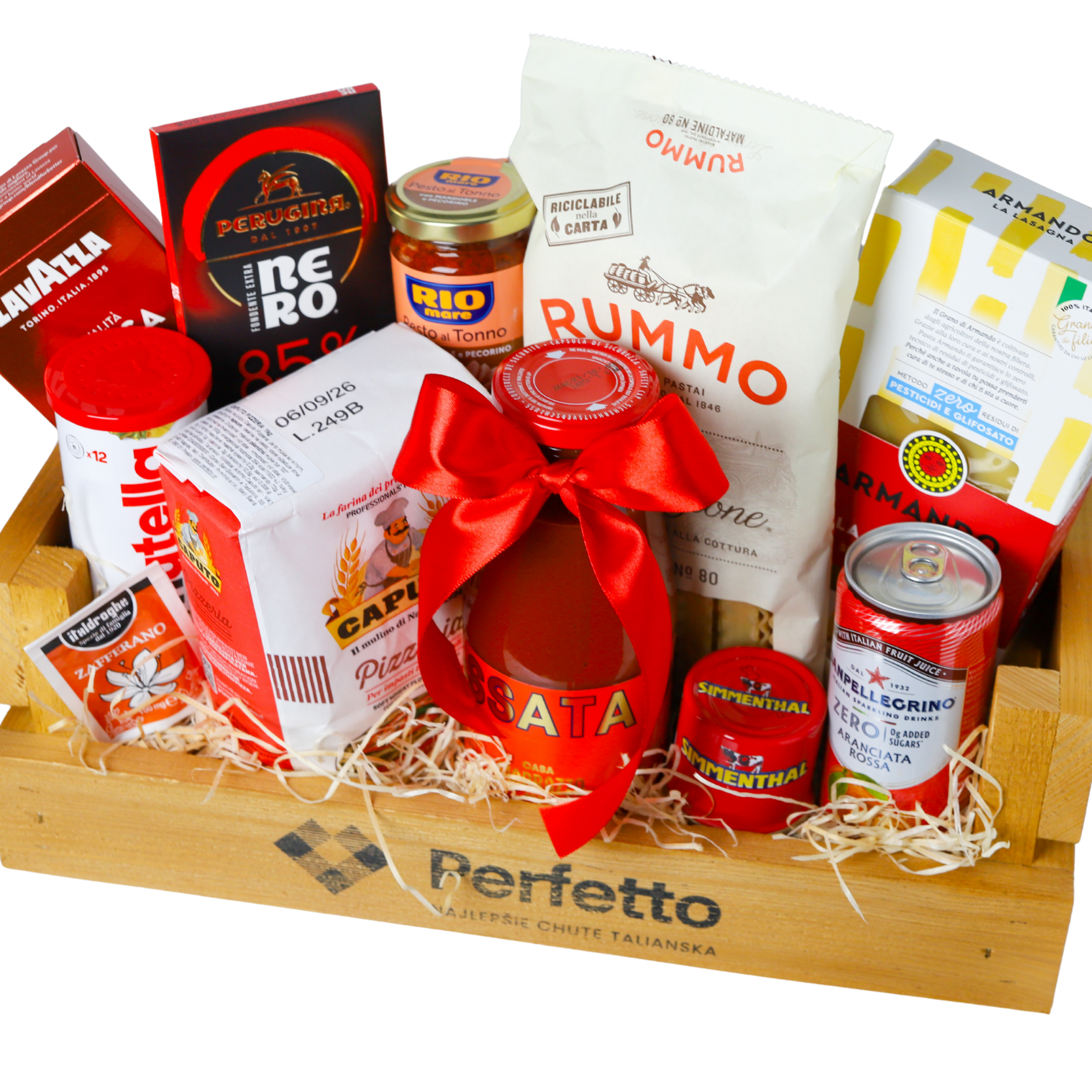 Ferrero Nutella sušienky v tube 166g, Rio Mare tuniakové pesto s mandľami a pecorinom 130g, Grano Armando Lasagne 500g,  Rummo Mafaldine 500g, Casa Marrazzo passata bio 690g, Simmenthal konzervované hovädzie mäso 90g, Sanpellegrino Zero červený pomaranč 330ml, Italdroghe šafrán mletý 0,1g,  LavAzza kávové kapsule Qualità Rossa 57g, Perugina 85% extra horká čokoláda 86g, Caputo talianska múka Pizzeria "00" 1kg, Darčeková Bednička M, Balenie (celofán + mašľa).