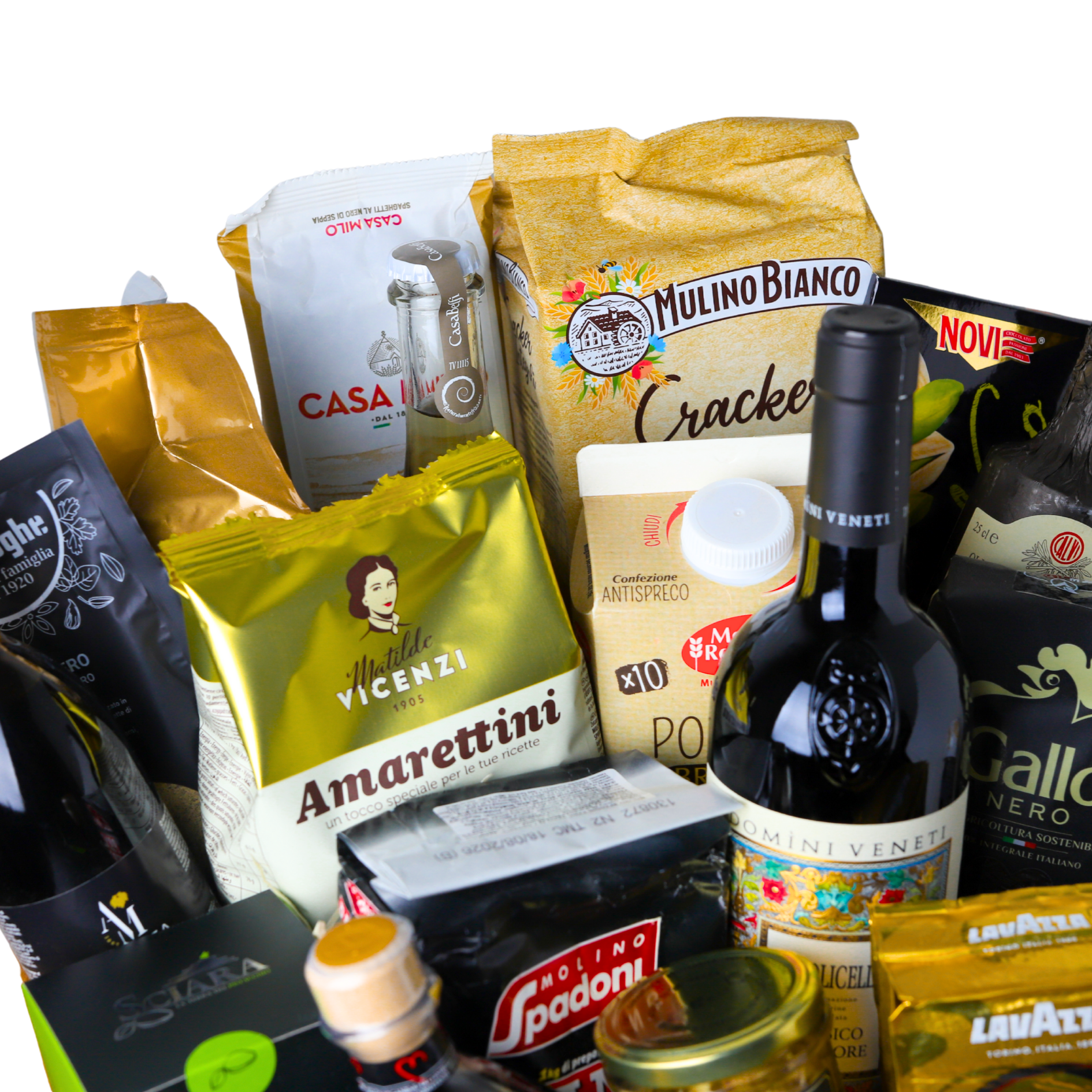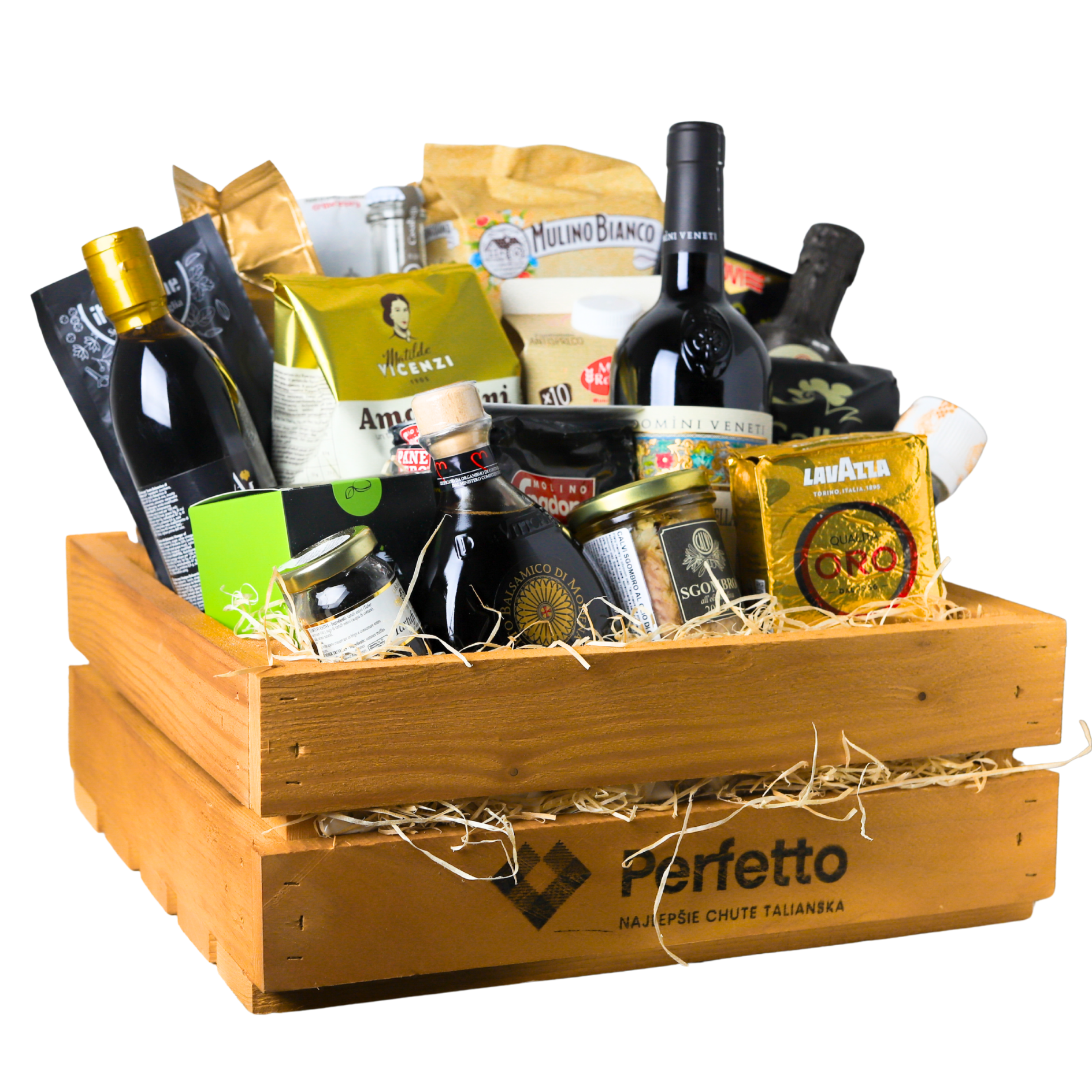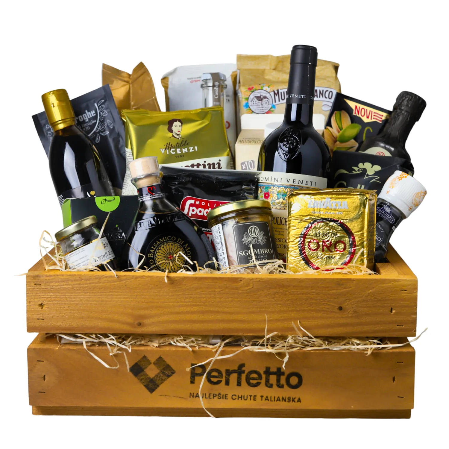 Urbani Tartufi letné hľuzovky 25g, Due Vittorie balzamikový ocot z Modeny IGP 250ml, Calvi makrela v olivovom oleji 200g, LavAzza Qualitá Oro mletá káva 250g, Drogheria čierna Cyperská soľ 50g, Domìni Veneti Pruviniano Valpolicella Classico Superiore DOC 0,75l, Molino Spadoni talianska zmes na prípravu čierneho chleba 1kg, Sciara pistáciové Croccantini 90g, Andrea Milano krémové balzamiko 500ml, Matilde Vicenzi sušienky Amarettini 100g, Gallo čierna ryža 500g, Molino Rossetto Polenta 750g, Calvi Mosto Argento extra panenský olivový olej 0,25l, Novi horká čokoláda s kúskami chrumkavých pistácii 75g, Italdroghe mleté čierne korenie 40g, Casa Milo sépiové Spaghetti 500g, Caffé Diemme Oro 1kg, Albino Armani Casa Belfi Naturalmentefrizzante Bianco 0,75l, Mulino Bianco celozrnné krekry 500g, Darčeková Bednička XL, Balenie (celofán + mašľa).