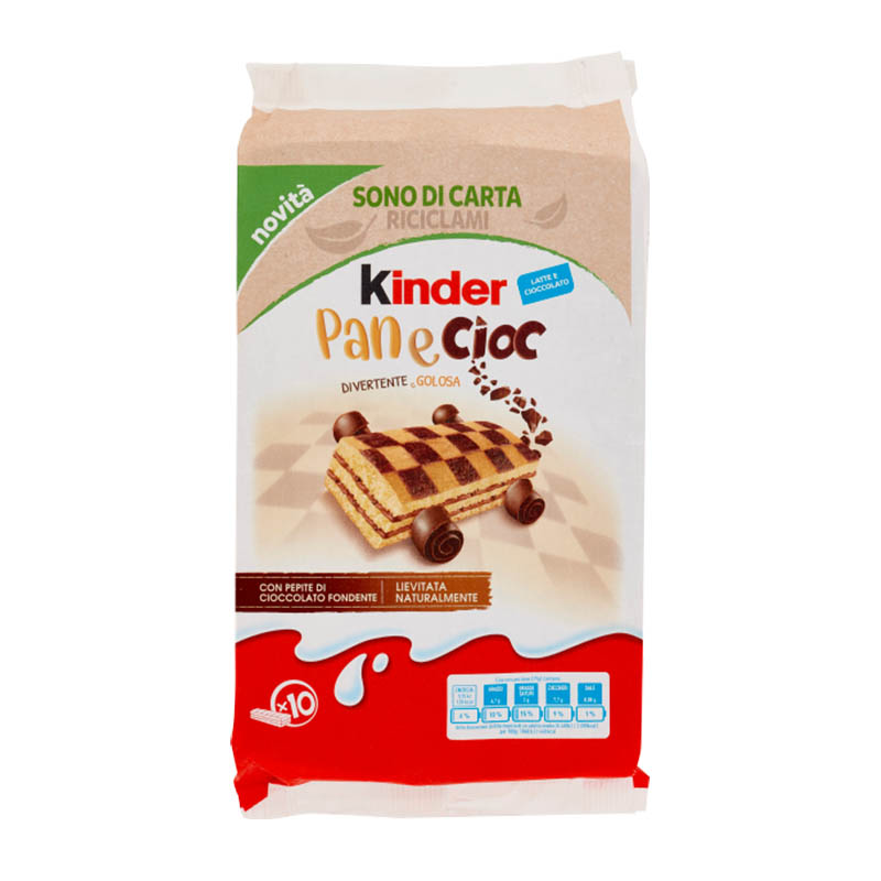 Kinder Pan e Cioc charakterizuje jedinečný recept, ktorý spája jednoduchosť prirodzene kysnutého piškótového cesta s chrumkavosťou pravých čokoládových kúskov. Zábavný a chutný snack so šachovnicou na povrchu. Navyše Pan e Cioc je so zníženým obsahom tuku a každé sústo tohto výborného snacku sľubuje sladké potešenie.