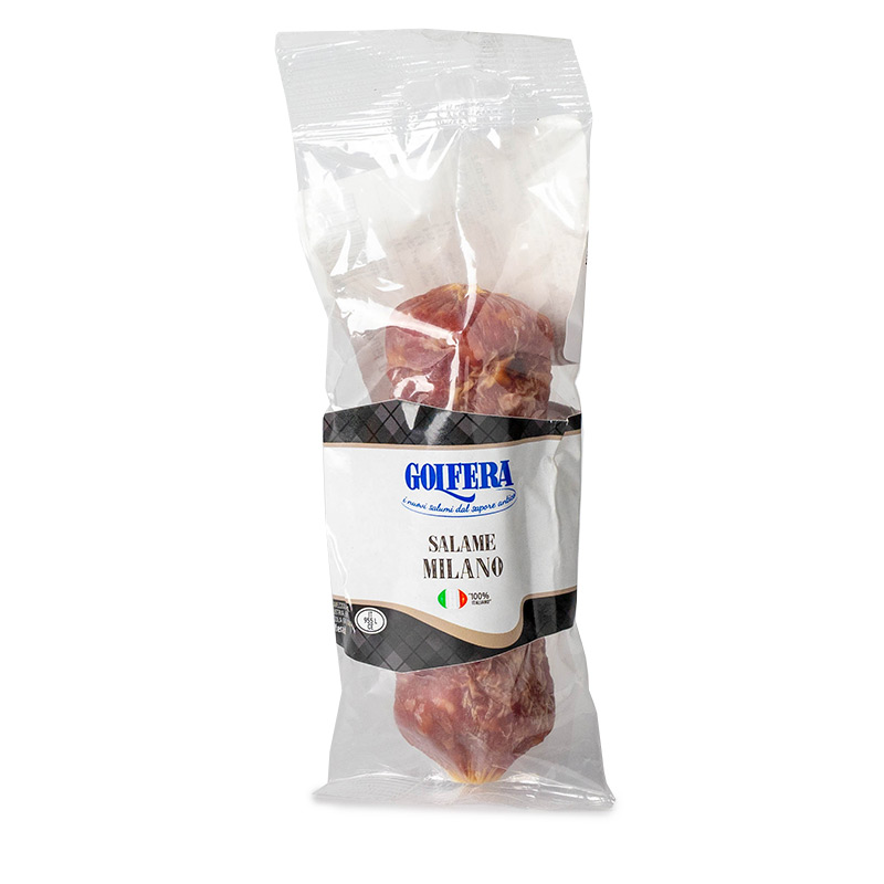 Tradičná talianska saláma MILANO od GOLFERA je právom považovaná za delikatesu severného Talianska. Je vyrobená zo starostlivo vybraného bravčového mäsa talianskeho pôvodu, ktoré je jemne mleté a dochutené soľou, čiernym i bielym korením, vínom a čerstvým cesnakom. Pred tým, než sa balí, zreje 90 dní.