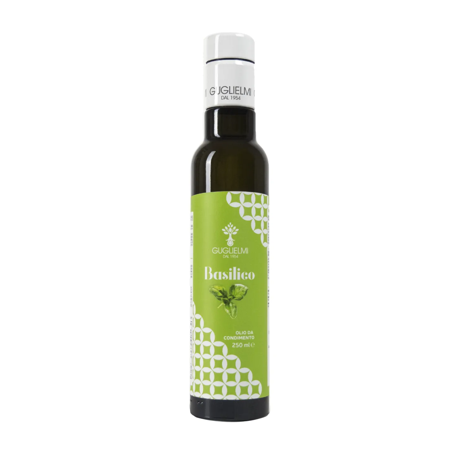 Guglielmi Olio da Condimento al Basilico je extra panenský olivový olej ochutený čerstvou bazalkou, ktorý v sebe spája jednoduchosť a sviežosť typickú pre taliansku kuchyňu. Základ tvorí 97 % extra panenského olivového oleja lisovaného za studena a 3 % aromatickej bazalky, ktorá mu dodáva prirodzenú vôňu a lahodnú chuť. Olej má zlatozelenú farbu, plnú arómu a typicky bylinný charakter, ktorý okamžite vyvolá spomienku na leto v Taliansku.