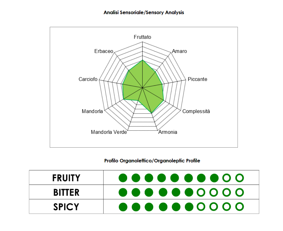 Monocultivar Coratina je ideálny pre milovníkov výrazných, autentických chutí. Vďaka svojej štruktúre a sile sa výborne hodí na dochutenie grilovaných jedál, mäsa, strukovín, zeleniny či syrov. Jeho charakteristická korenistosť vynikne aj pri jednoduchom použití – napríklad na čerstvom chlebe alebo bruschette. Olej má veľmi nízku aciditu (0,15 %) a vysoký obsah polyfenolov (644 mg/kg), čo potvrdzuje jeho kvalitu, stabilitu a zdravotné benefity.