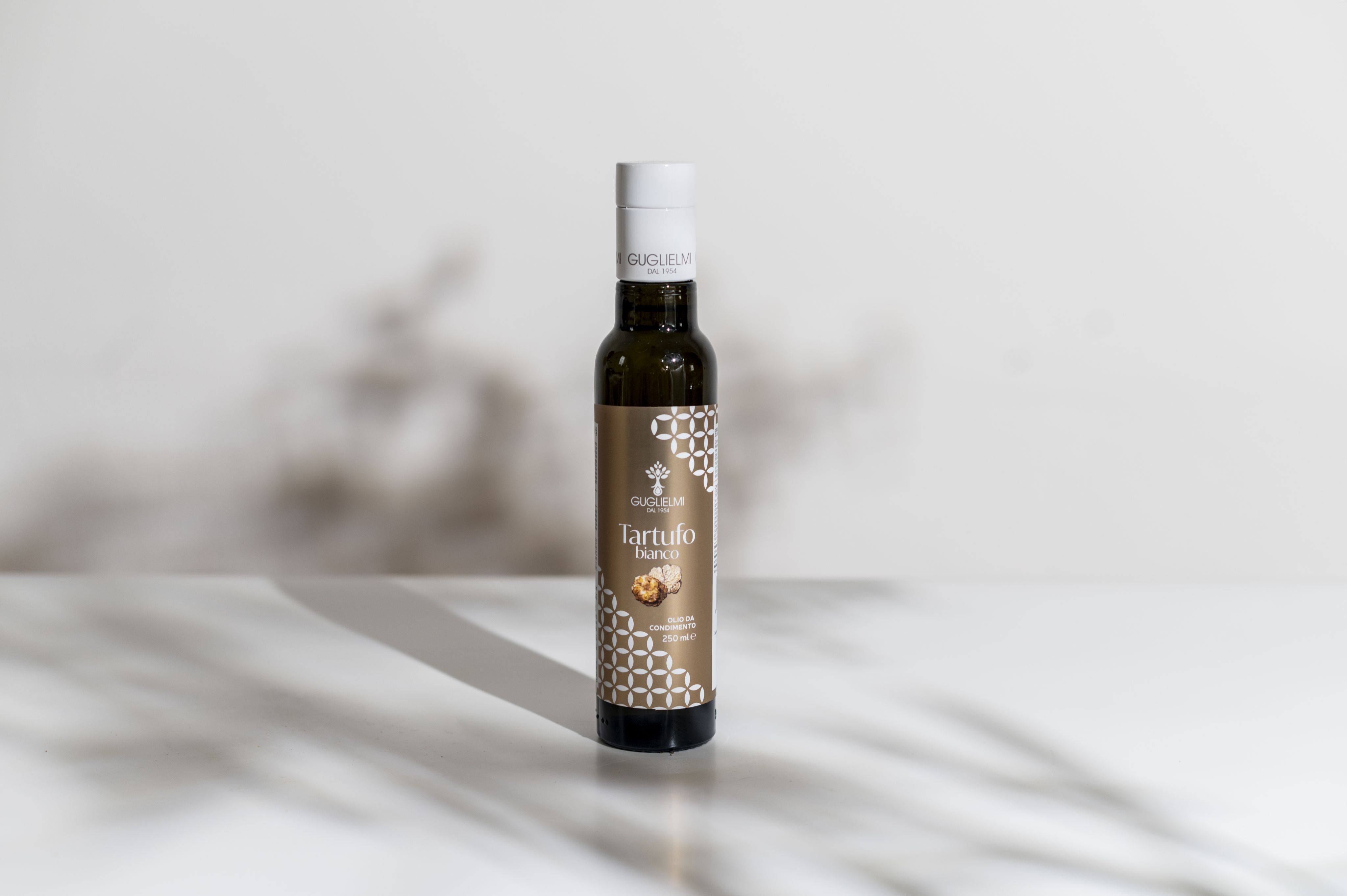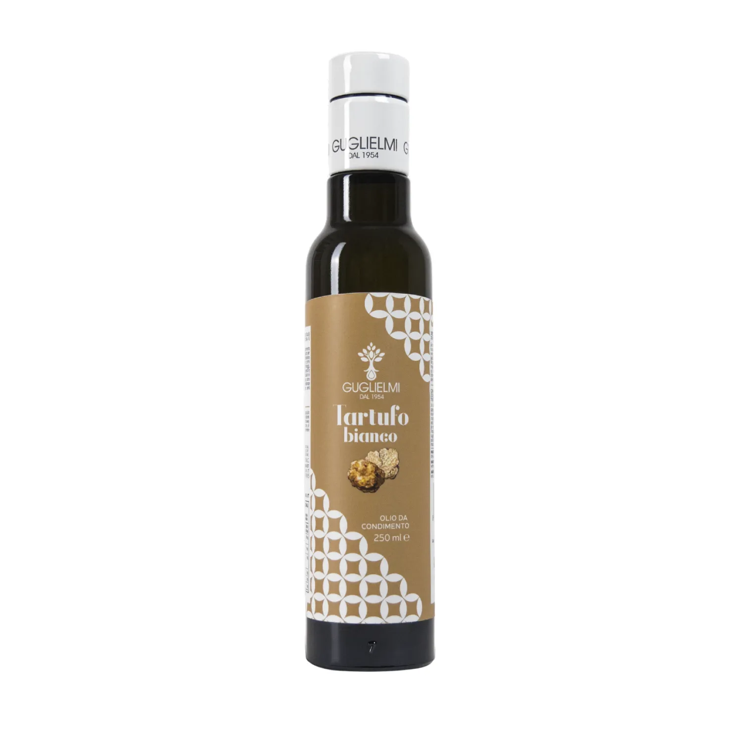 Guglielmi Olio da Condimento al Tartufo Bianco je prémiový ochutený extra panenský olivový olej s príchuťou bielej hľuzovky, vytvorený pre tých, ktorí si chcú dopriať výnimočný gastronomický zážitok. Vychádza z kvalitného extra panenského olivového oleja z Apúlie, lisovaného za studena, do ktorého je pridané prírodné aróma bielej hľuzovky. Výsledkom je harmonická kombinácia jemného, ovocného oleja a výraznej, no elegantnej arómy hľuzovky, ktorá jedlám dodáva sofistikovaný charakter a hĺbku chuti.