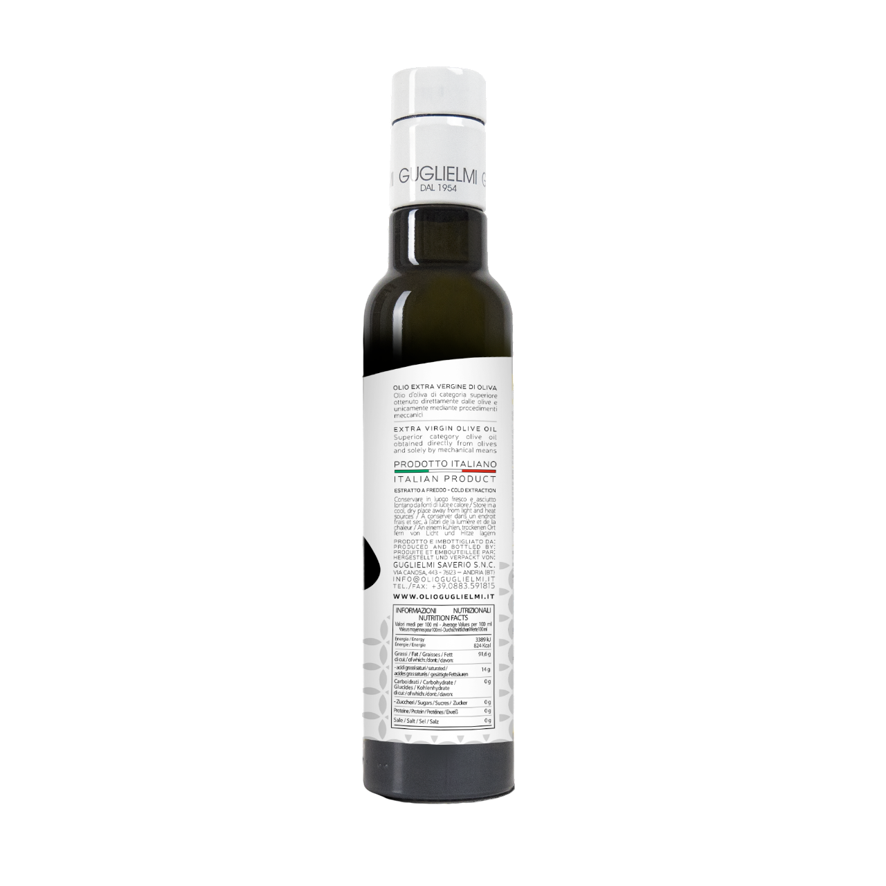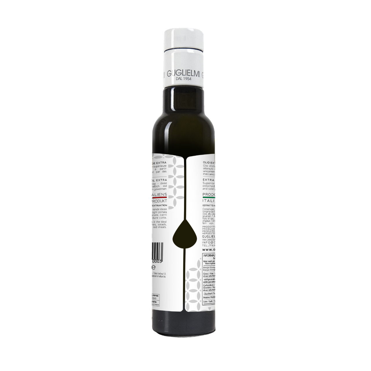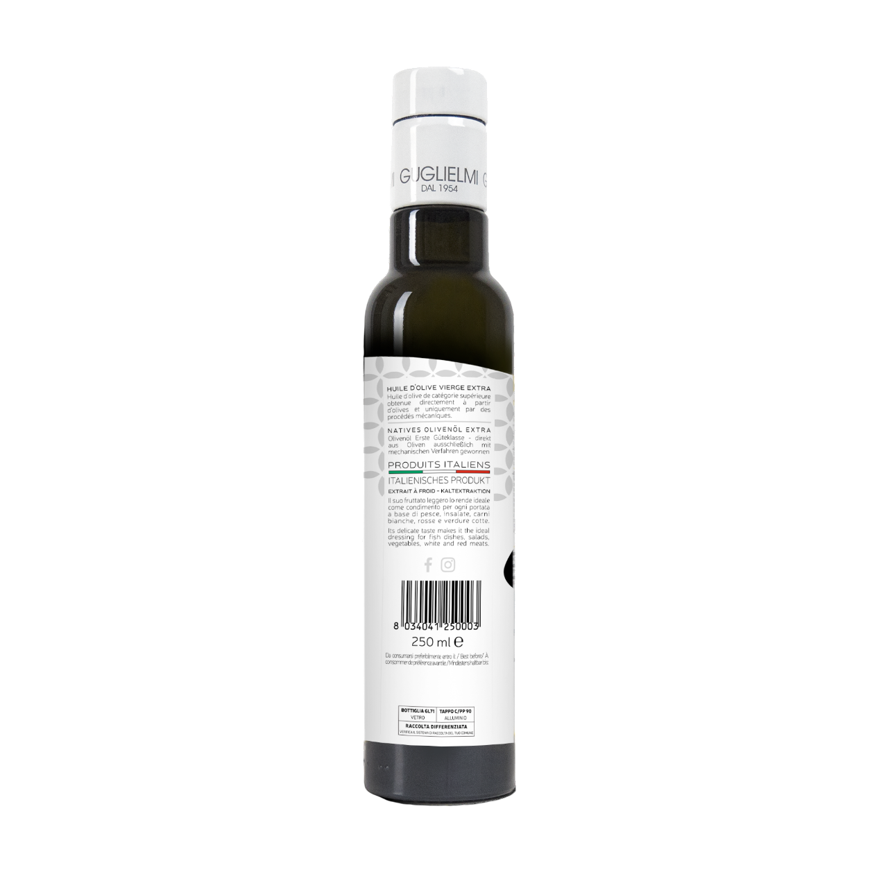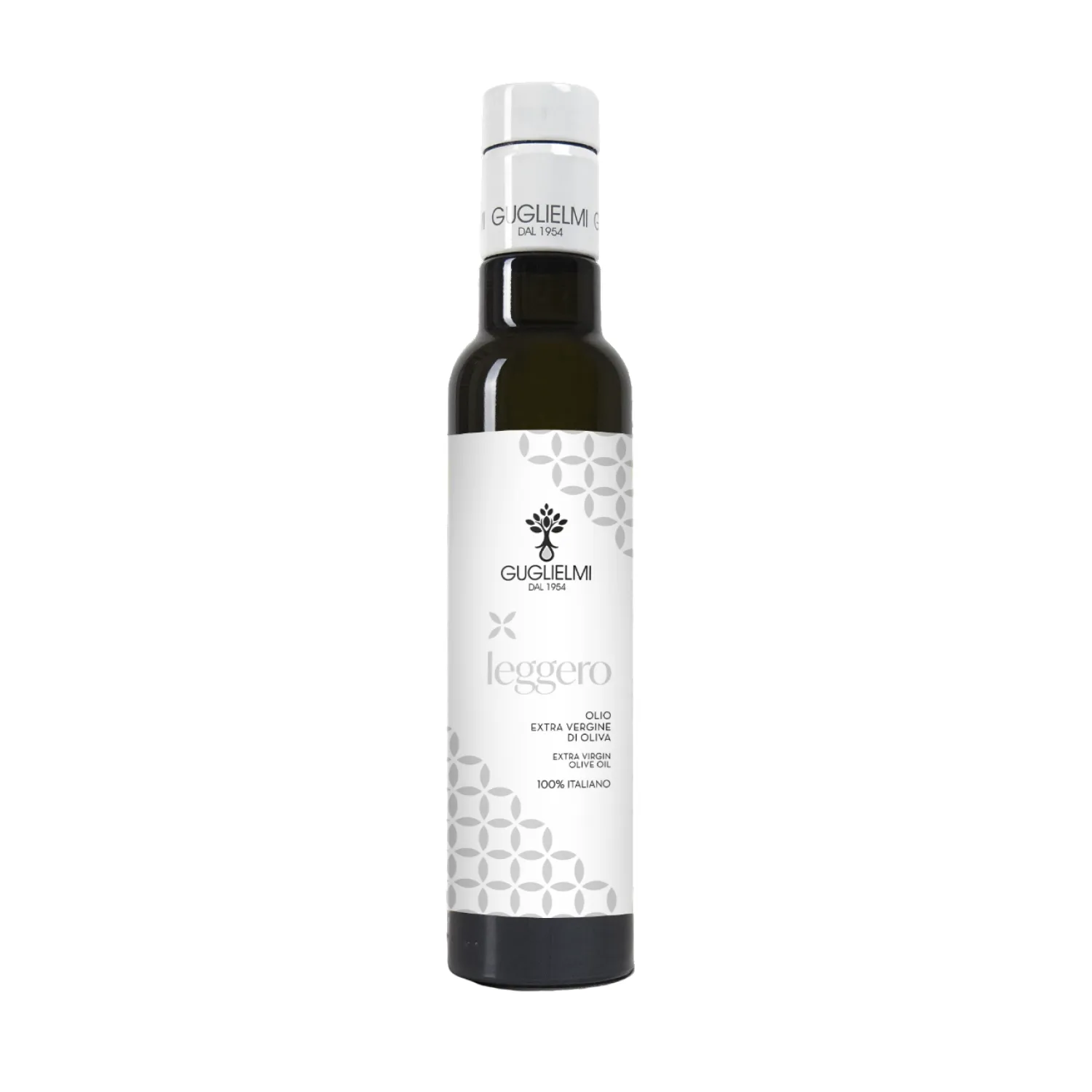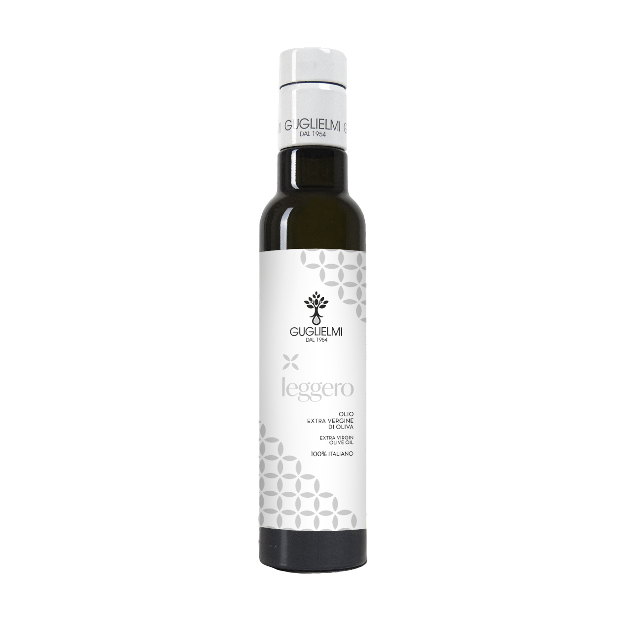 Guglielmi Leggero je extra panenský olivový olej s jemným a vyváženým charakterom, vytvorený pre tých, ktorí uprednostňujú delikátnejšie chute. Vyrába sa z olív odrôd Peranzana (80 %) a Leccino (20 %), typických pre región Apúlia, kde sa pestujú pod teplým talianskym slnkom. Olej sa lisuje výhradne za studena, čo zabezpečuje zachovanie jeho prirodzenej arómy a vysokej kvality. Má svetlozelenú farbu so zlatistými odleskami, čistý vzhľad a jemnú vôňu po mandliach a jablku s nádychom kvetinovej sviežosti. Chuť je sladko ovocná, ľahká a príjemne hladká, bez výraznej horkosti či korenistosti.