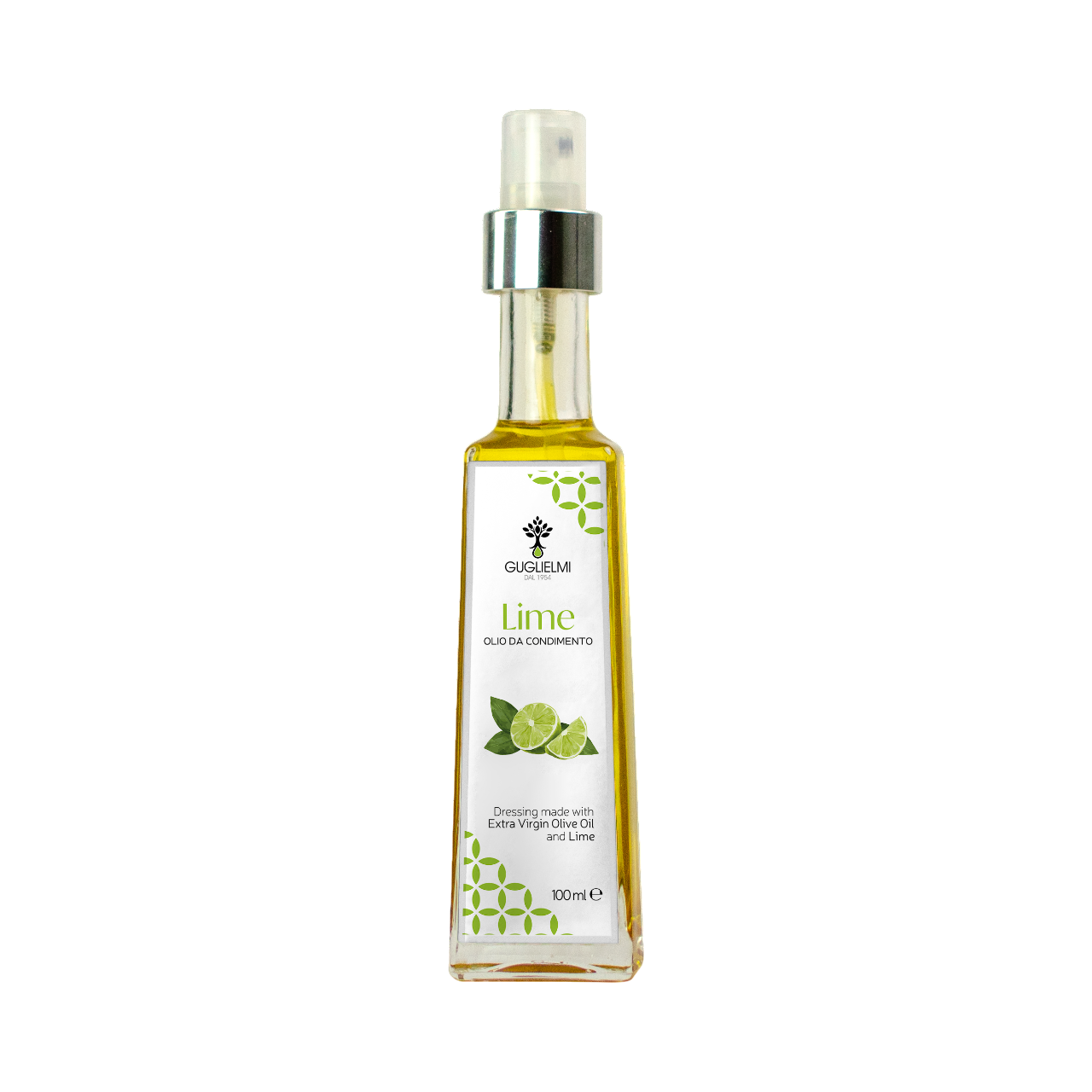 Guglielmi Olio da Condimento al Lime Spray je extra panenský olivový olej s príchuťou čerstvého limetky v praktickom sprejovom balení, ktoré spája taliansku tradíciu s moderným používaním. Vyrába sa z 97 % extra panenského olivového oleja lisovaného za studena a 3 % prírodného limetkového extraktu, vďaka čomu má sviežu citrusovú vôňu, jemne kyslastú chuť a žiarivú zlatistú farbu. Výsledkom je olej, ktorý dokonale vyvažuje ovocnosť olív s ľahkým tropickým tónom limetky.