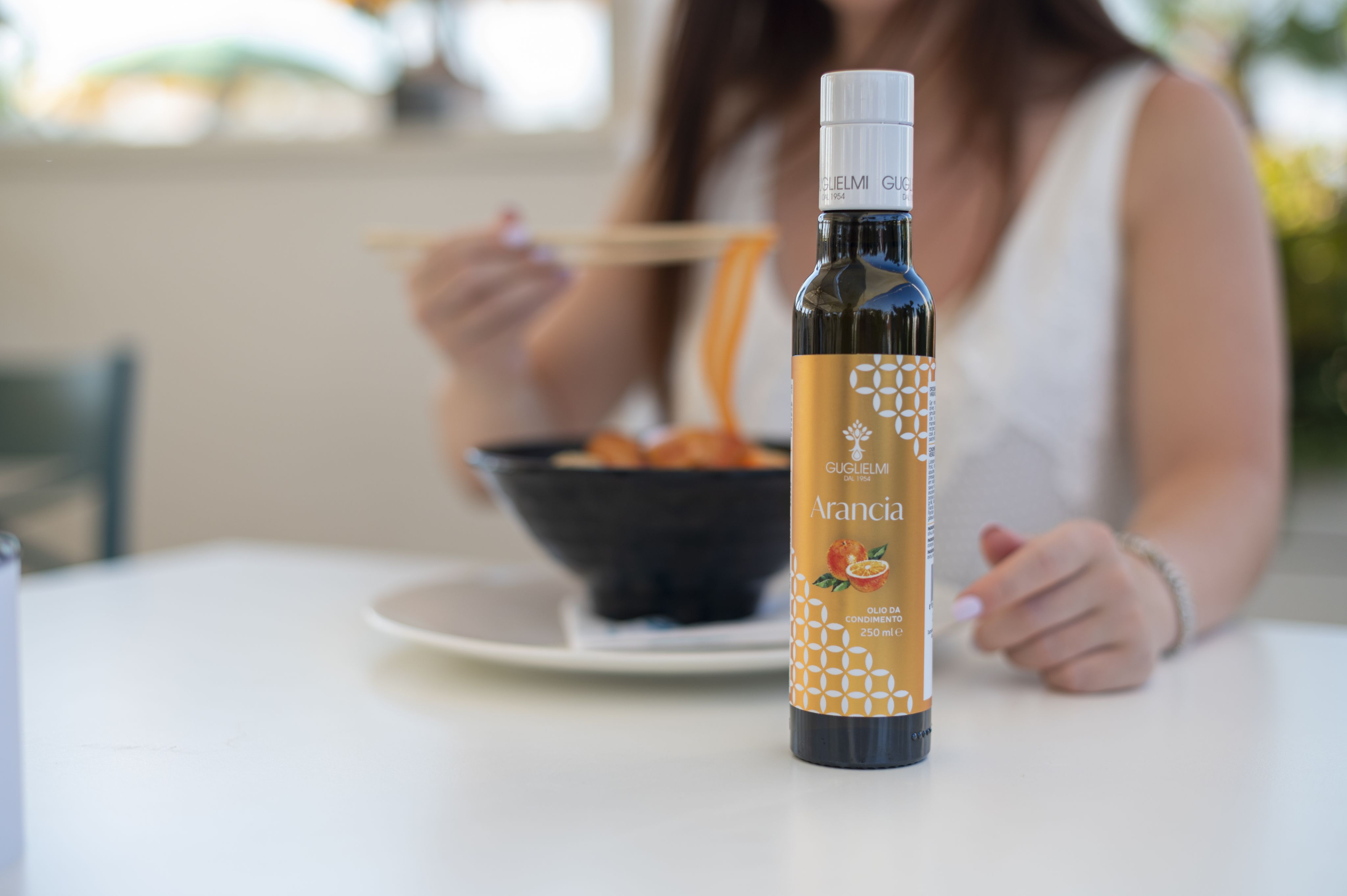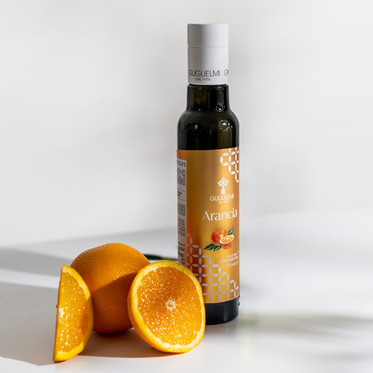 Guglielmi Olio da Condimento all’Arancia je extra panenský olivový olej ochutený čerstvými pomarančmi, ktorý v sebe spája jemnosť apúlskeho olivového oleja a sviežosť južanského ovocia. Vyrába sa z 97 % extra panenského olivového oleja lisovaného za studena a 3 % prírodných pomarančov, čím vzniká harmonická zmes s jemne citrusovou arómou a zlatisto-zelenou farbou. Chuť je plná, ovocná a prirodzene sladkastá, s osviežujúcim tónom pomaranča, ktorý zvýrazní chuť jedla bez toho, aby ju prebil.