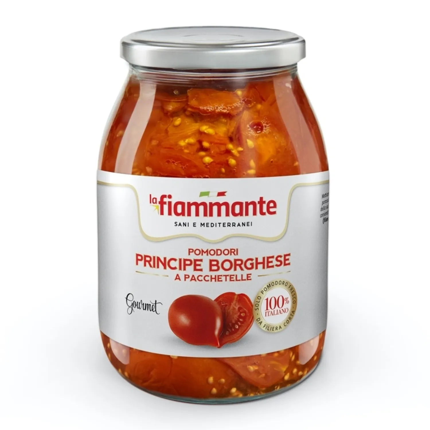 Cherry paradajky La Fiammante “a Pacchetelle” sú typickým produktom z južného Talianska získavaným z Cherry paradajok rozrezaných na polovicu, ktoré sú následne ručne vložené do sklenených pohárov a stabilizované použitím procesu tepelnej pasterizácie.