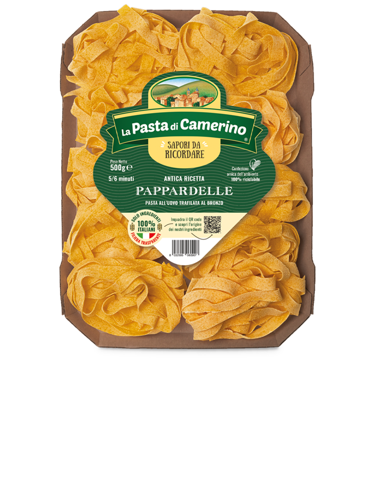 Kto by nepoznal typický obraz talianskej kuchyne, kde na stole nechýba tá pravá cestovina, osviežujúce víno a zvuky veselých melódií v pozadí? La Pasta di Camerino vám prinesie presne túto atmosféru, pretože ich pappardelle sú symbolom talianskej tradície, vďaka čomu získate nezabudnuteľný kulinárny zážitok pri každom súste. Vždy používajú k produkcii len čerstvé pasterizované vajíčka v pomere 35% a veľmi kvalitnú múku Grano Duro, bez dalších dodatkov v podobe vody a iných surovín. Sušia sa pomaly pri nízkych teplotách, aby dosiahli správnu konzistenciu. Vaječné cestoviny od značky La Pasta di Camerino sú chuťovo perfektné. Pappardelle sú široké, ale tenké, s dokonalým spracovaním, ktoré zaisťuje, že sa nelepia.