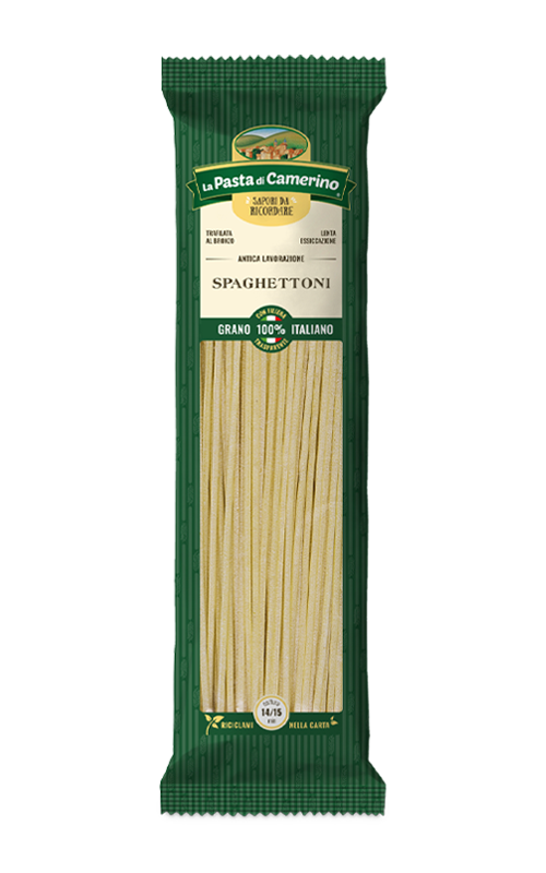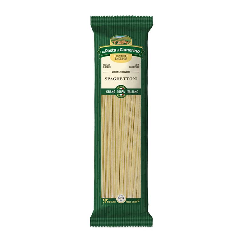 La Pasta di Camerino Spaghettoni sú bezvaječné semolinové cestoviny s väčším priemerom, ktoré ponúkajú plnšiu štruktúru a výraznejší zážitok pri každom súste. Vďaka svojej hrúbke výborne ladia s jednoduchými paradajkovými omáčkami, cesnakom a olivovým olejom, morskými plodmi či jemnými syrovými omáčkami. Spaghettoni pri varení držia tvar, rovnomerne mäknú a nelepia sa, čo z nich robí skvelú voľbu na sviatočné varenie aj rýchle každodenné recepty.