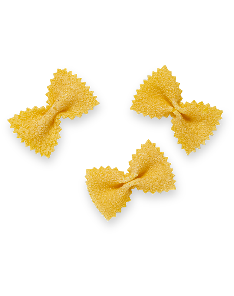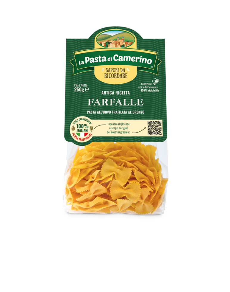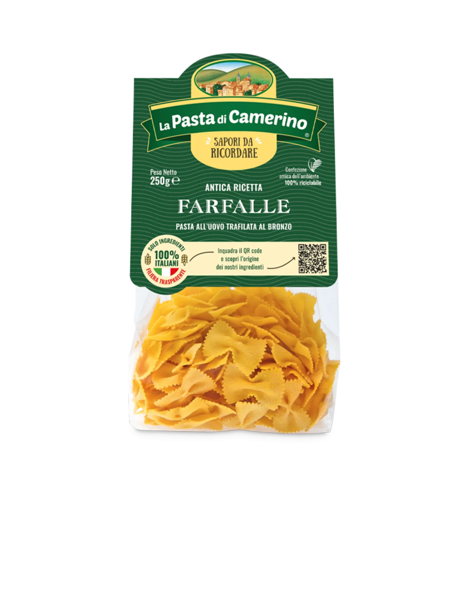 La Pasta di Camerino Farfalle sú vaječné cestoviny v tvare motýlikov, vyrobené z talianskej pšenice a čerstvých vajec, pričom výrobca používa vysoký podiel vajec – až 6 na kilogram múky. Tento pomer dodáva cestovinám prirodzene žltú farbu, plnšiu chuť a pevnú štruktúru, ktorá ostáva stabilná aj po uvarení. Tvar farfalle je praktický najmä v jedlách, kde cestoviny potrebujú držať omáčku v záhyboch a na širšej ploche.