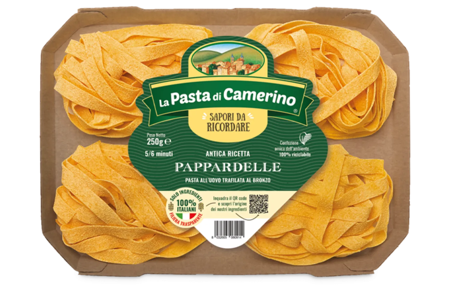 Značka La Pasta di Camerino pochádza z regiónu Marche a patrí medzi popredných talianskych výrobcov remeselných vaječných cestovín. Pri výrobe používa tradičné postupy: pomalé miešanie cesta, jeho odpočívanie a sušenie pri nízkej teplote. Tento spôsob zachováva prirodzenú štruktúru, pružnosť a autentickú chuť cestovín, ktoré pripomínajú domáce.
