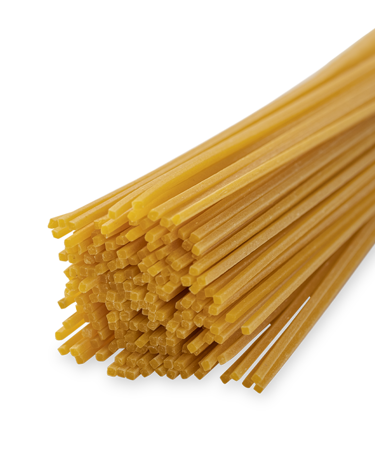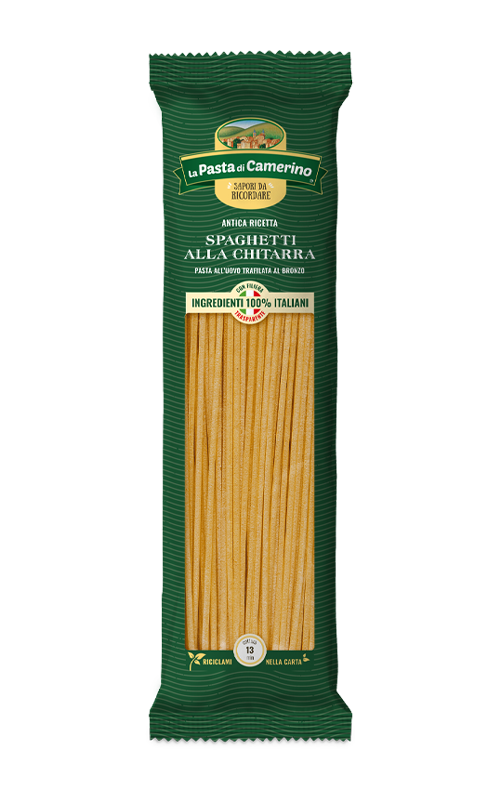 La Pasta di Camerino Spaghetti alla Chitarra sú vaječné cestoviny štvorcového prierezu, vyrábané tradičnou technikou „alla chitarra“, pri ktorej sa cesto pretlačí cez struny nástroja pripomínajúceho gitaru. Tento tvar im dodáva väčšiu hrúbku a pevnú štruktúru, takže cestovina lepšie drží omáčku a má výraznejšiu, plnšiu chuť. Výrobca používa vysoký podiel vajec – 6 vajec na kilogram múky – čo cestovinám dodáva prirodzene žltú farbu a autentickú vaječnú chuť.