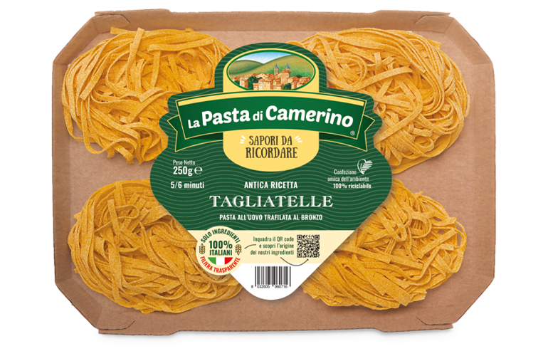 La Pasta di Camerino Tagliatelle sú vaječné cestoviny strednej šírky, rezané na dlhé, ploché pásiky typické pre tagliatelle. Sú vyrobené z talianskej pšenice a čerstvých vajec, vďaka čomu majú prirodzene žltú farbu, pevnú štruktúru a počas varenia si dobre držia tvar. Ide o univerzálny typ cestoviny, ktorý sa hodí k rôznym omáčkam a ľahko viaže chuť.