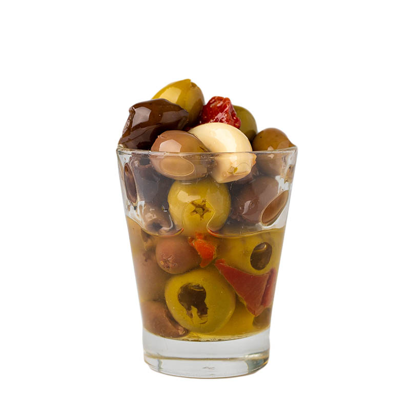 Vitajte v svete gastronomických zážitkov, kde sa spojili talianske olivy štyroch rôznych druhov - zelené olivy Castelvetrano, zelené olivy Nocellara of Etna, čierne olivy Peranzana a olivy Leccino. Táto výnimočná zmes prináša na stôl bohatstvo viacero chutí a farieb. Predstavte si, ako sa starostlivo zbierajú talianske olivy, aby sa potom zmiešali s jemným olejom, kúskami žltých a červených paprík, celými strúčikmi cesnaku a výberom korenín. Neobsahujú žiadne konzervanty, čo je zárukou prírodných a autentických chutí.