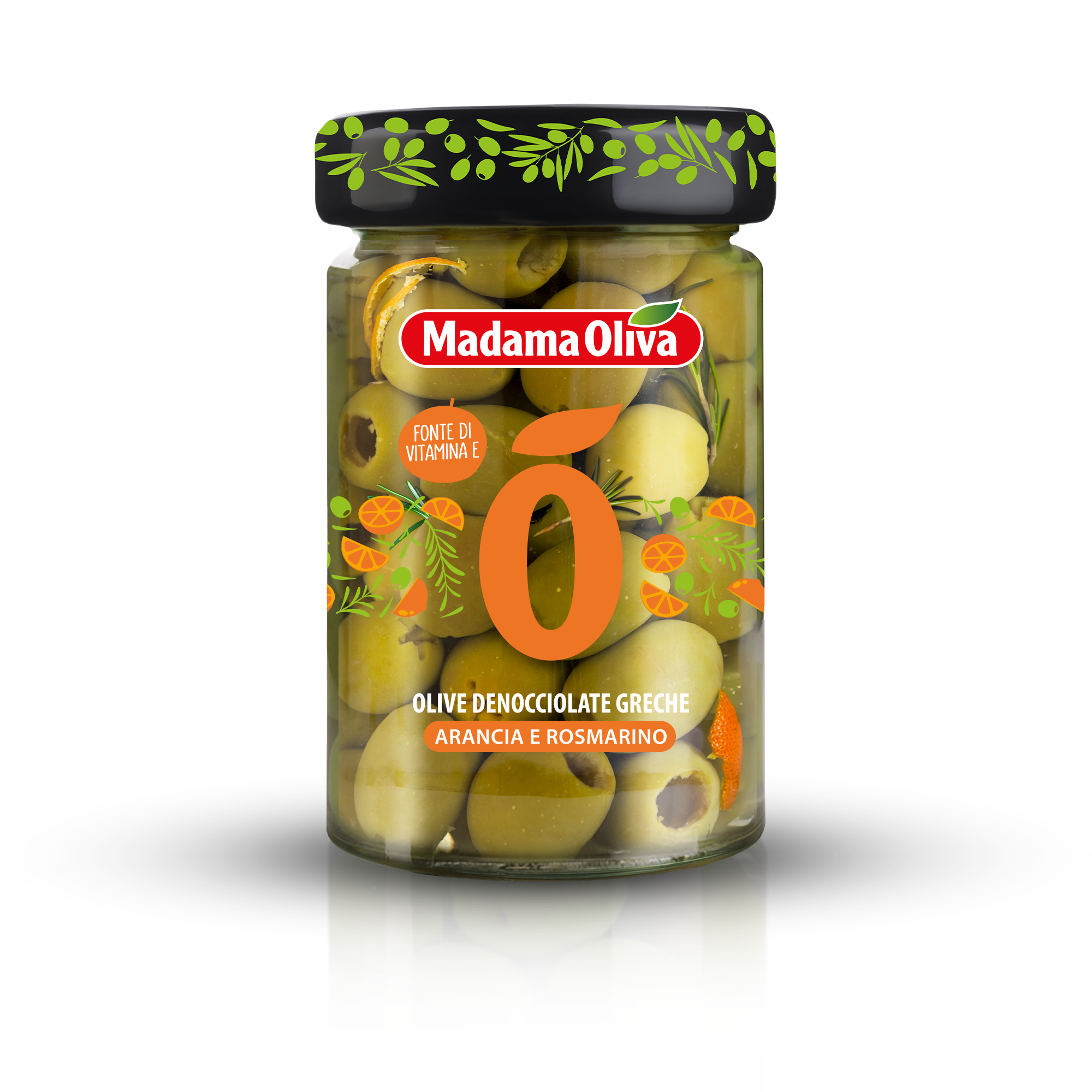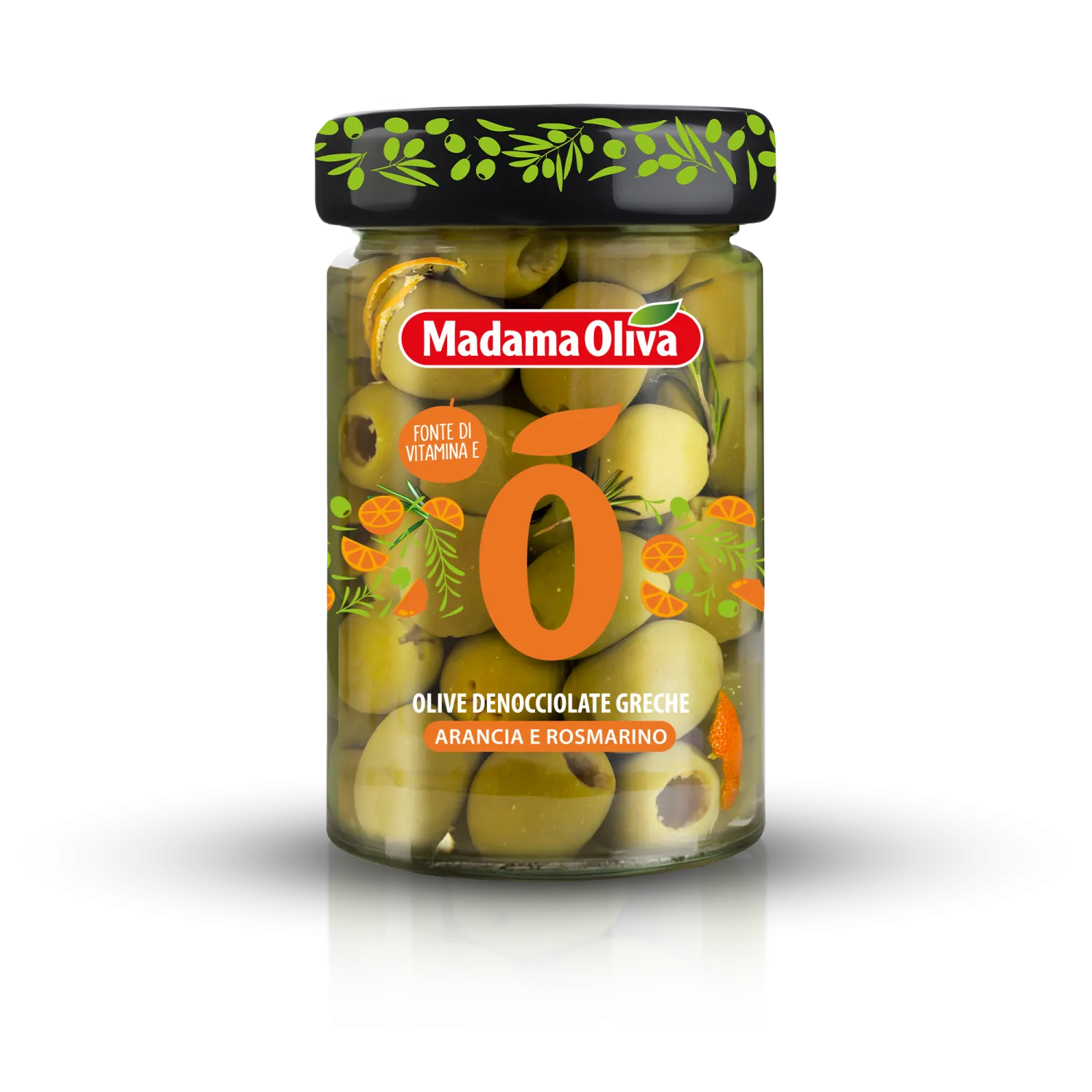 Madama Oliva grécke zelené olivy bez kôstky s pomarančom a rozmarínom v slanom náleve sú jedinečnou kombináciou chutí, ktorá spája výraznú arómu gréckych olív s jemnou citrusovou sladkosťou pomaranča a sviežim tónom rozmarínu. Starostlivo vybrané olivy sú zbavené kôstok a naložené do vyváženého slaného nálevu, ktorý zachováva ich prirodzenú chuť a chrumkavosť. Vďaka spojeniu byliniek a citrusov vzniká harmonická delikatesa s vyváženou chuťou – jemne slanou, sviežou a aromatickou.