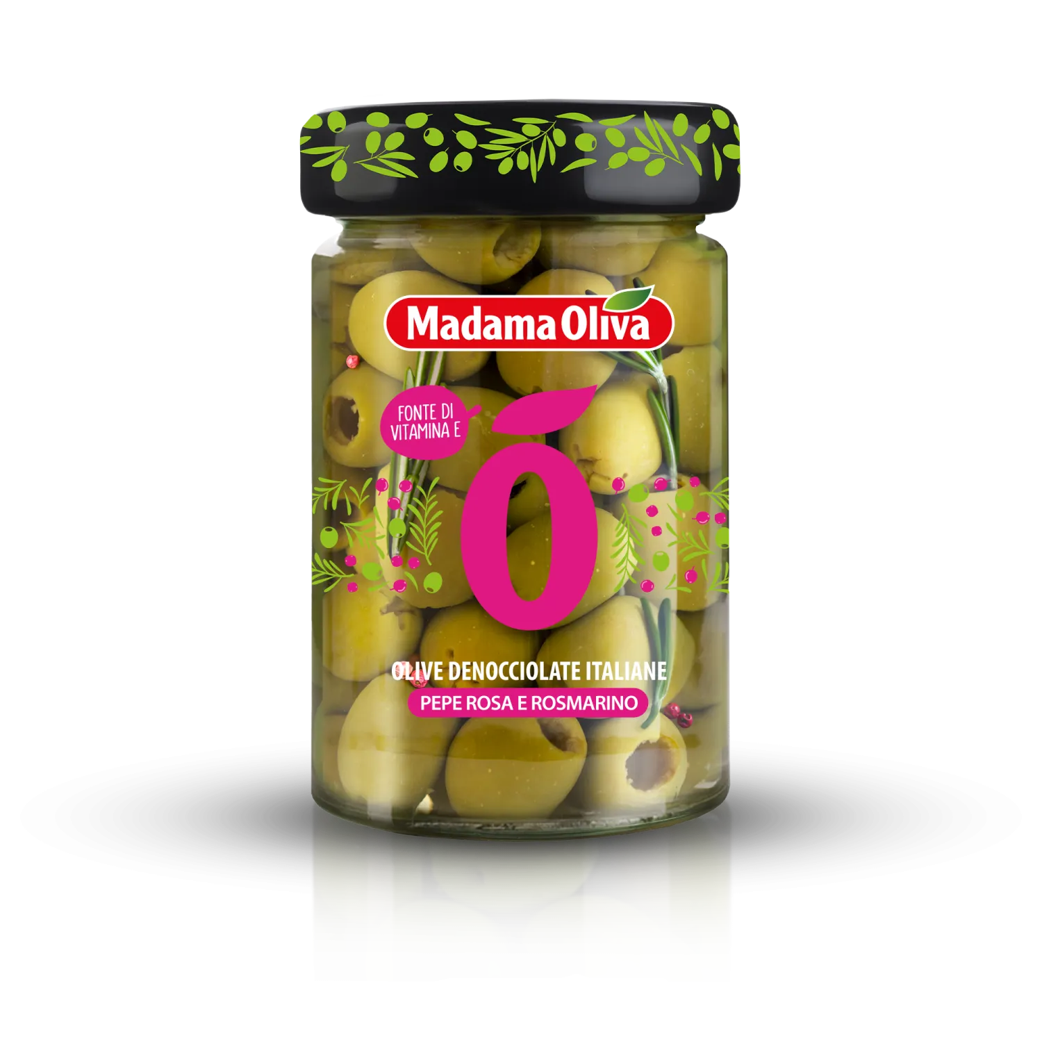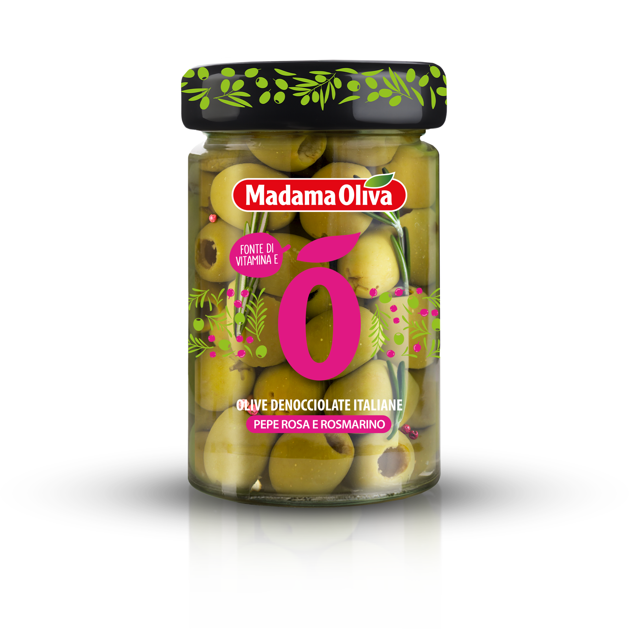 Madama Oliva zelené olivy bez kôstky s ružovým korením a rozmarínom v slanom náleve 300g