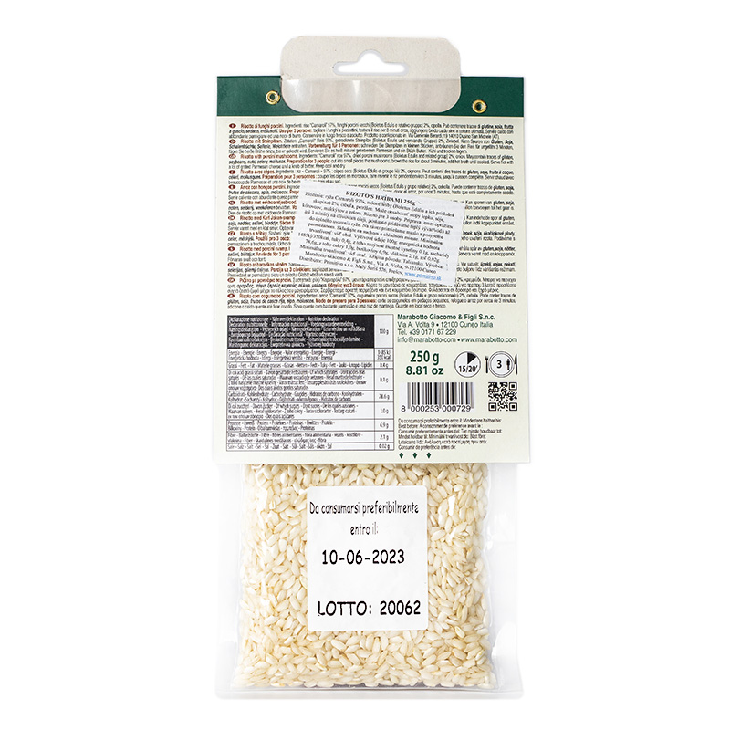 Zloženie: ryža Carnaroli 97%, sušené hríby (Boletus Edulis a ich príslušná skupina) 2%, cibuľa, petržlen. Môže obsahovať stopy lepku, sóje, kôrovcov, mäkkýšovzeleru.