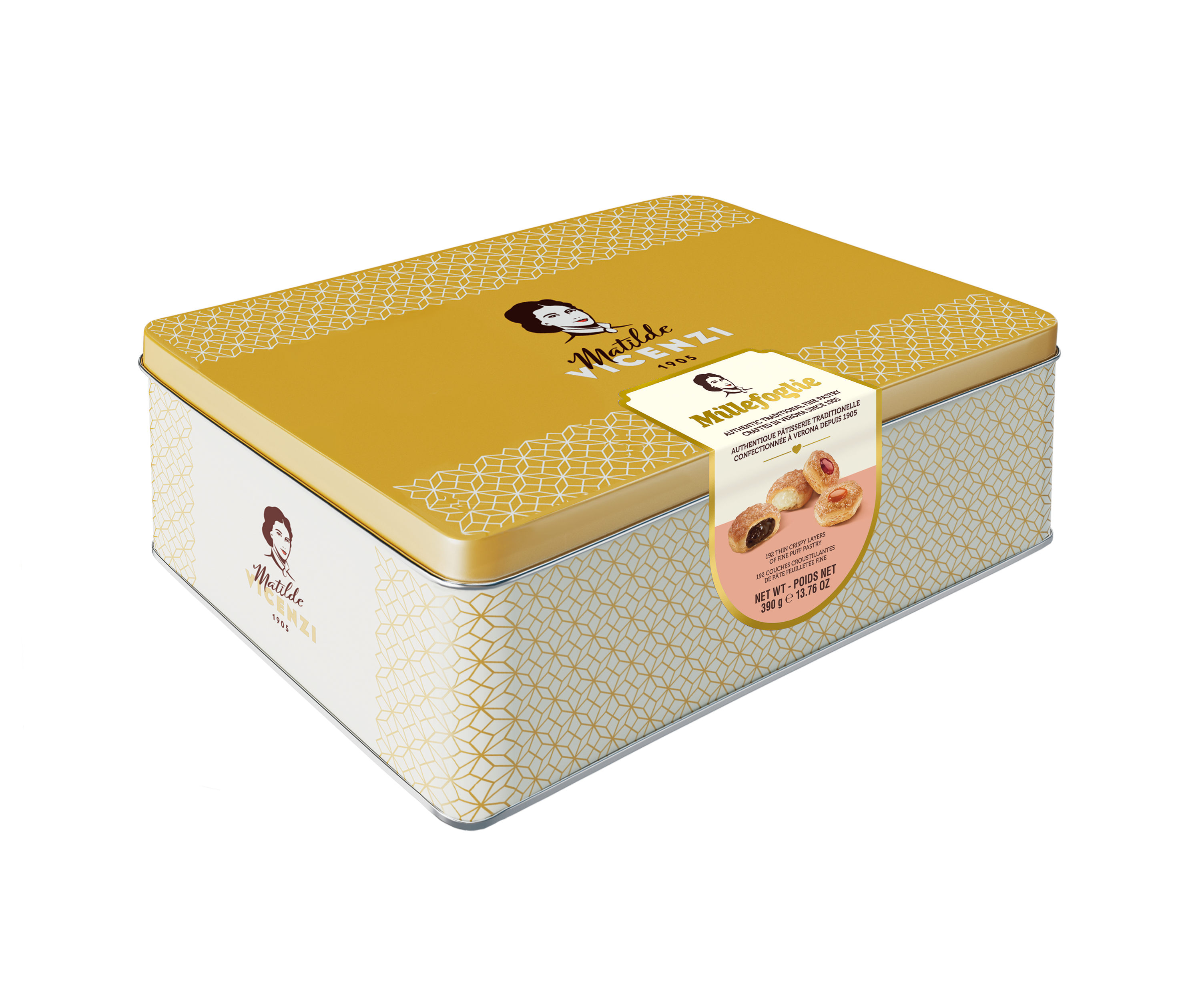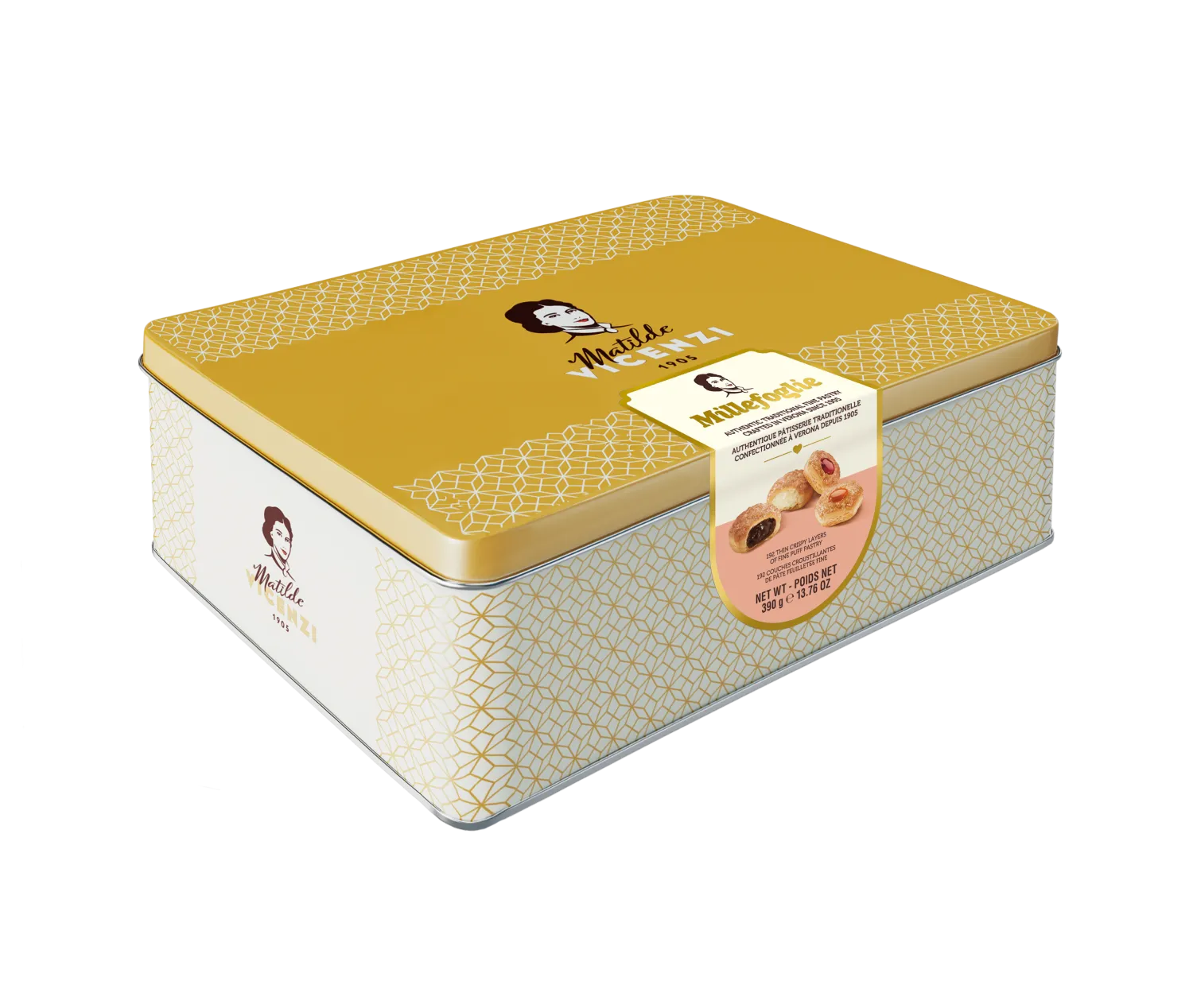 Predstavujeme vám Matilde Vicenzi Millefoglie výber, kde sa stretáva to najlepšie pečivo z lístkového cesta, zabalené v štýlovom plechovom boxe s hmotnosťou 390 gramov. Táto exkluzívna kolekcia lístkového cesta zanecháva jedinečný dojem na vašich chuťových pohárikoch.