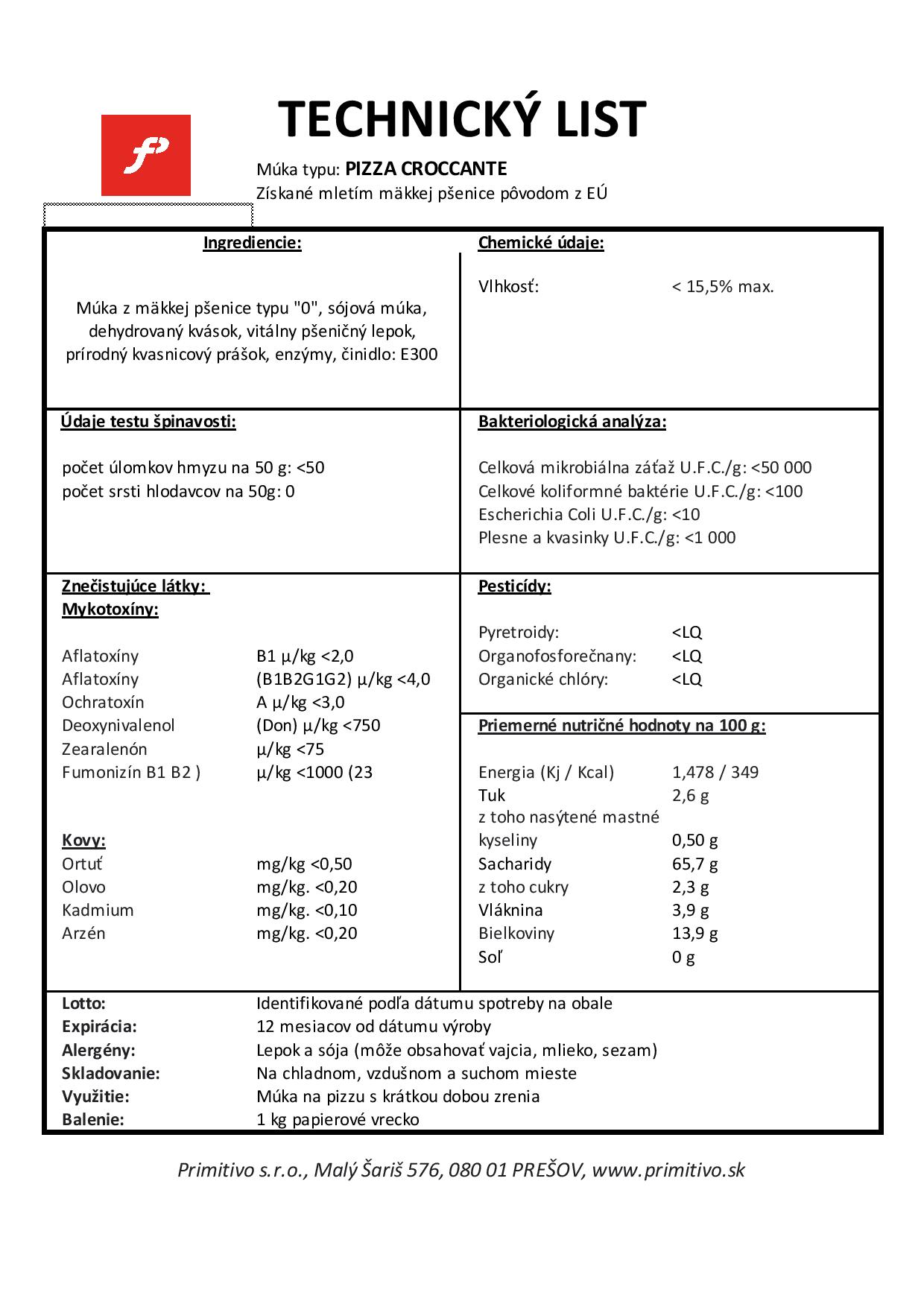 Zloženie: jemná pšeničná múka typ „0“, sójová múka, dehydrované kysnuté cesto, vitálny pšeničný lepok, prášok z prírodného droždia. Môže obsahovať sezam, vajcia a mlieko.