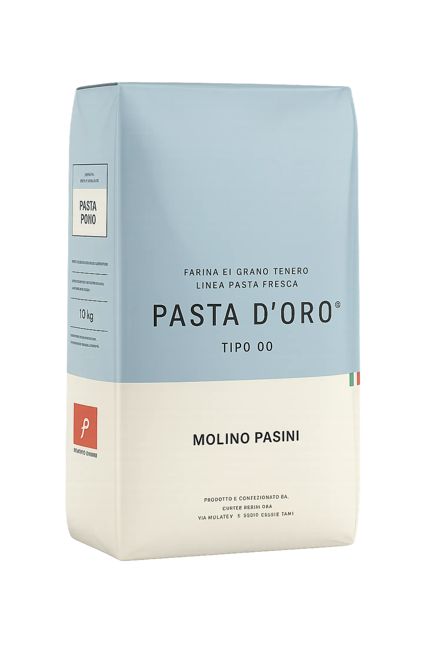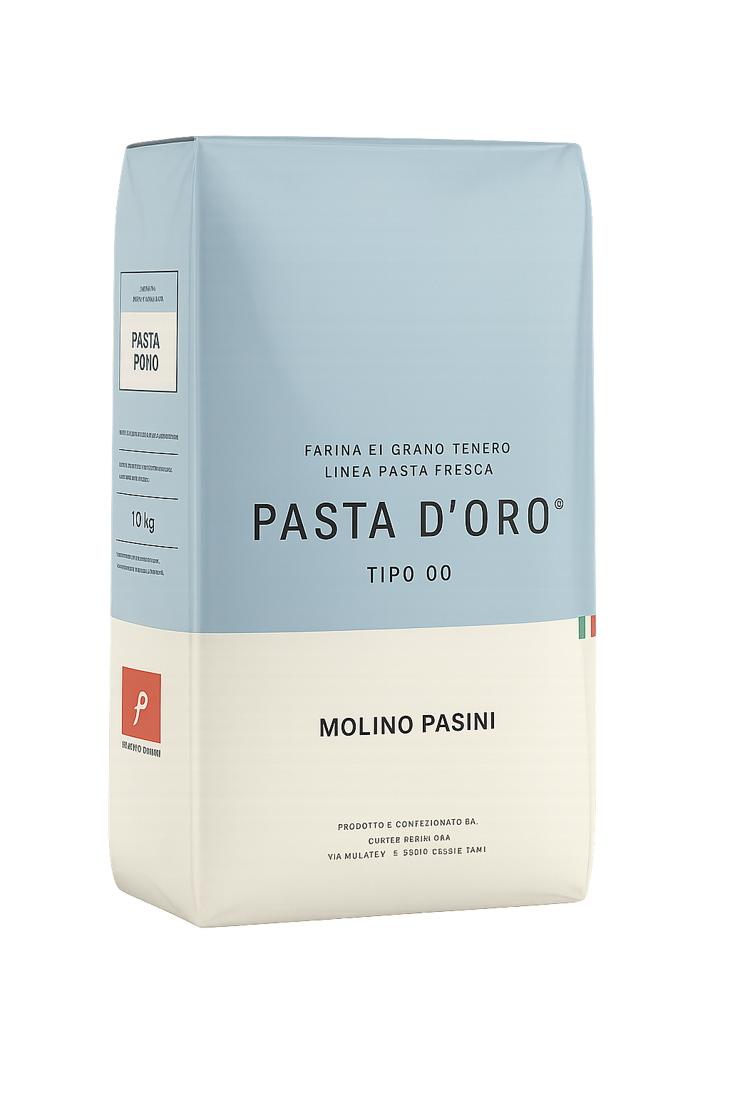 Predstavujeme vám Pasta d'Oro ® - pšeničnú múku typu "00" špeciálne určenú na výrobu čerstvej cestoviny. Múka ideálna pre tradičné čerstvé cestoviny a plnené cestoviny. Dokonale sa hodí na ručné použitie, ale aj na miesenie a ťahanie v strojoch, čo umožňuje krátky čas miesenia. Molino Pasini sa rozhodlo registrovať ochrannú známku jedného zo svojich výnimočných produktov ako PASTA D' ORO ® "Farina del mio sacco" - čerstvá cestovinová línia.Nadšenie, ktoré sa okolo tohto produktu vytvorilo, vyvolalo potrebu registrovať ochrnnú známku na jej názov, aby jú chránilo pred možnými imitáciami, ktoré by ohrozili reputáciu založenú na najvyššej kvalite.