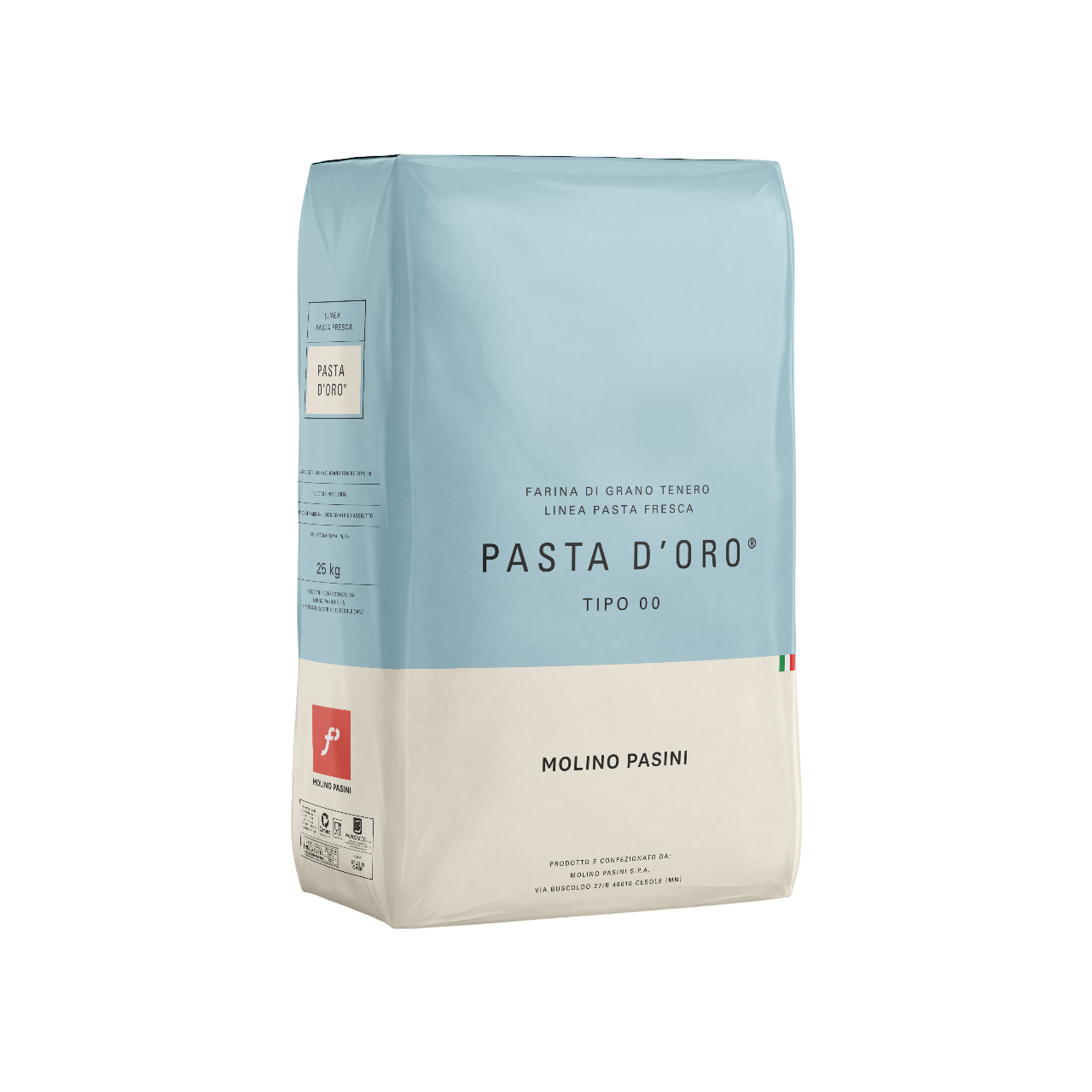 Predstavujeme vám Pasta d'Oro ® - pšeničnú múku typu "00" špeciálne určenú na výrobu čerstvej cestoviny. Múka ideálna pre tradičné čerstvé cestoviny a plnené cestoviny. Dokonale sa hodí na ručné použitie, ale aj na miesenie a ťahanie v strojoch, čo umožňuje krátky čas miesenia. Molino Pasini sa rozhodlo registrovať ochrannú známku jedného zo svojich výnimočných produktov ako PASTA D' ORO ® "Farina del mio sacco" - čerstvá cestovinová línia.Nadšenie, ktoré sa okolo tohto produktu vytvorilo, vyvolalo potrebu registrovať ochrnnú známku na jej názov, aby jú chránilo pred možnými imitáciami, ktoré by ohrozili reputáciu založenú na najvyššej kvalite.
