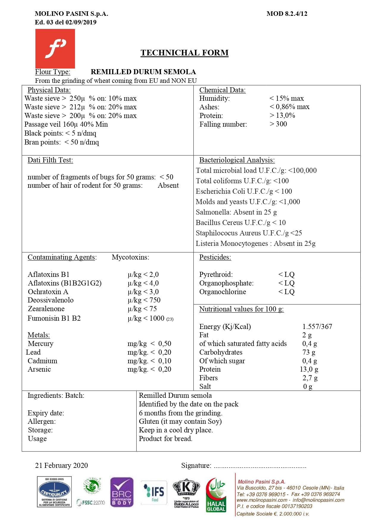 Molino Pasini Semola Rimacinata je špičková talianska múka vyrobená z najkvalitnejšej tvrdej pšenice. Táto múka je špeciálne upravená jemným mletím, čo jej dodáva ideálnu konzistenciu a jemnú textúru, perfektnú na výrobu tradičných talianskych cestovín, focaccie a chleba, alebo ako skvelý podsyp pri príprave pizze.