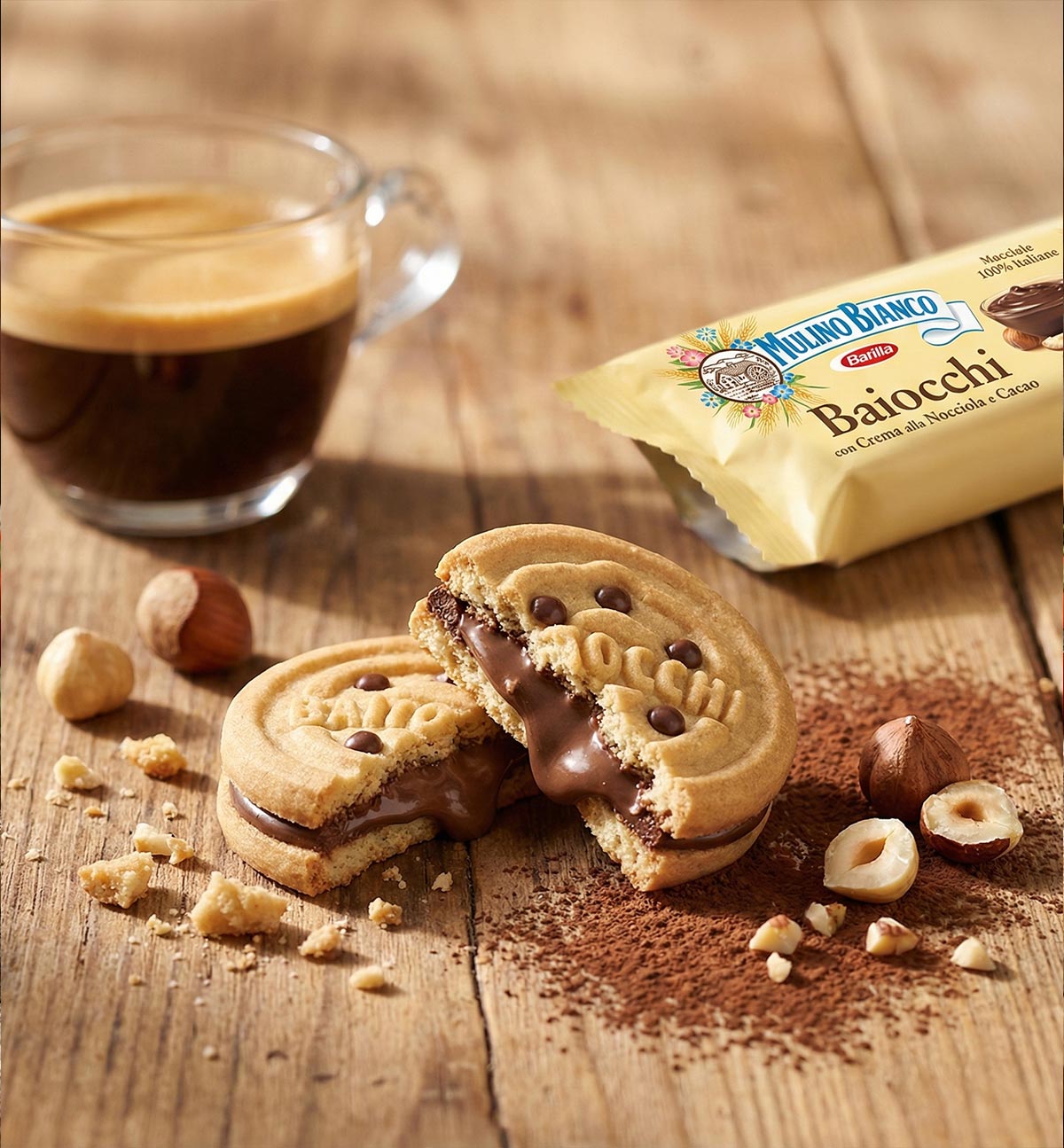 Produkty Mulino Bianco sú vyrábané bez umelých prísad, farbív a konzervantov, čím si zachovávajú svoju prirodzenú chuť a vysokú kvalitu. Práve preto majú kratší dátum minimálnej trvanlivosti v porovnaní s inými sušienkami či podobnými produktmi, čo je dôkazom ich autenticity a čerstvosti. Baiocchi od Mulino Bianco vyrobené z dvoch voňavých krehkých sušienok nezameniteľného tvaru, ktoré obsahujú jemnú náplň zo 100% talianskych lieskových orieškov a kakaa.