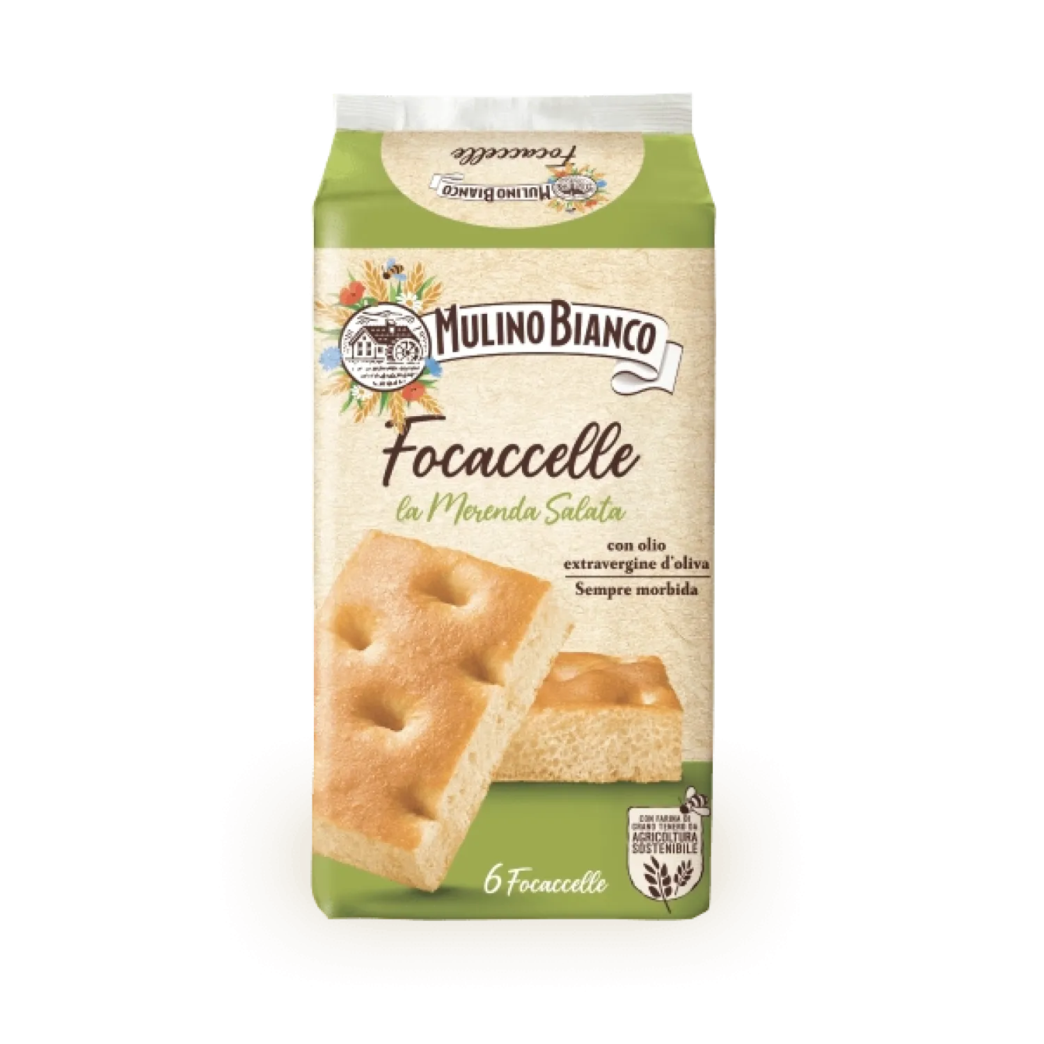 Mulino Bianco Focaccelle con Olio d'Oliva sú malé focaccie, ktoré spájajú tradičnú taliansku receptúru s praktickým moderným balením. Každý kus je obohatený o extra panenský olivový olej, ktorý mu dodáva jemnú a príjemne aromatickú chuť.