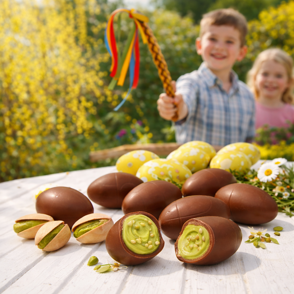 Novi Pistacchio čokoládové vajíčka s pistáciovým krémom sú mliečne čokoládové mini vajíčka plnené jemným pistáciovým krémom a doplnené o chrumkavú granellu z pistácií. Kombinácia mliečnej čokolády a pistáciovej náplne vytvára vyvážený kontrast medzi sladkosťou a prirodzenou, mierne orechovou chuťou pistácií, pričom kúsky pistácií dodávajú textúru a intenzívnejší zážitok z každého sústa. Ide o sezónny veľkonočný produkt, ktorý rozširuje pistáciový rad značky a nadväzuje na úspech ich plnenej mliečnej čokolády s pistáciovou náplňou.
