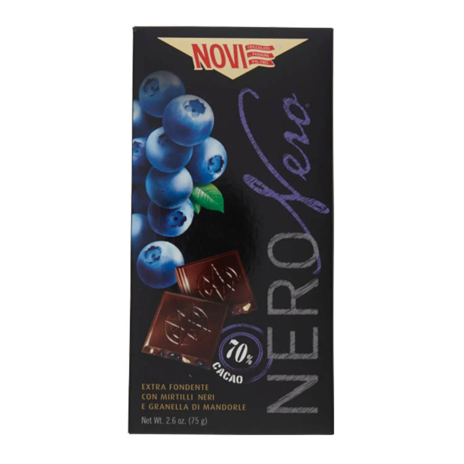Horká čokoláda od NOVI je bohatá 70% extra tmavá čokoláda zrodená zo šikovnej zmesi jemných kakaových bôbov, starostlivo pražených v továrni Novi Ligure v Piemonte, v prekvapivom spojení s kyslastou sviežosťou čučoriedok a chrumkavosťou mandlí. S horkastou a jemnou chuťou sa perfektne hodí ako sladká odmena, kedykoľvek počas dňa.