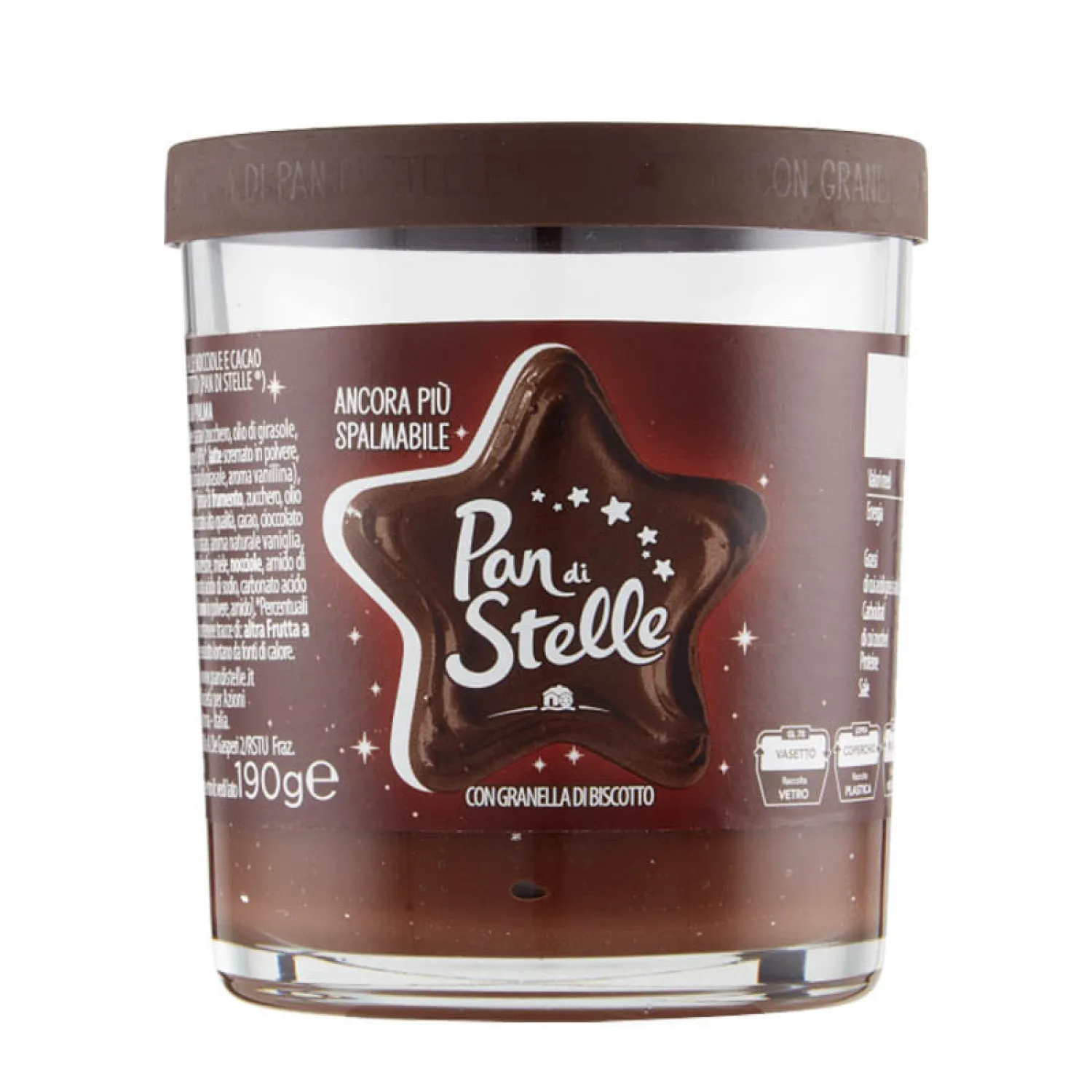 Pan di Stelle Creme je hviezdne stretnutie sladkého kakaového krému s lieskovými orieškami a kúskami sušienok Pan di Stelle. Lyžička tohto nátierkového krému dokáže premeniť každú výnimočnú chvíľu na niečo ešte magickejšie. Kakaový krém Pan di Stelle pochádza zo spojenia surovín, ako sú čerstvé vajcia a 100% talianske lieskové orechy.