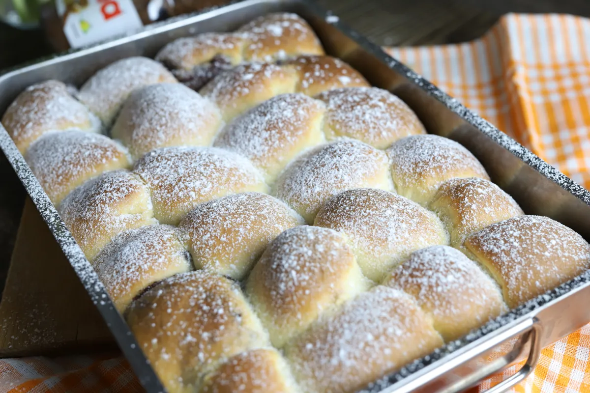 Pečieme v rúre vyhriatej na 180 °C približne 30–35 minút, kým nie sú buchty krásne zlatisté. Po upečení ich ešte horúce potrieme roztopeným maslom a posypeme práškovým cukrom.
