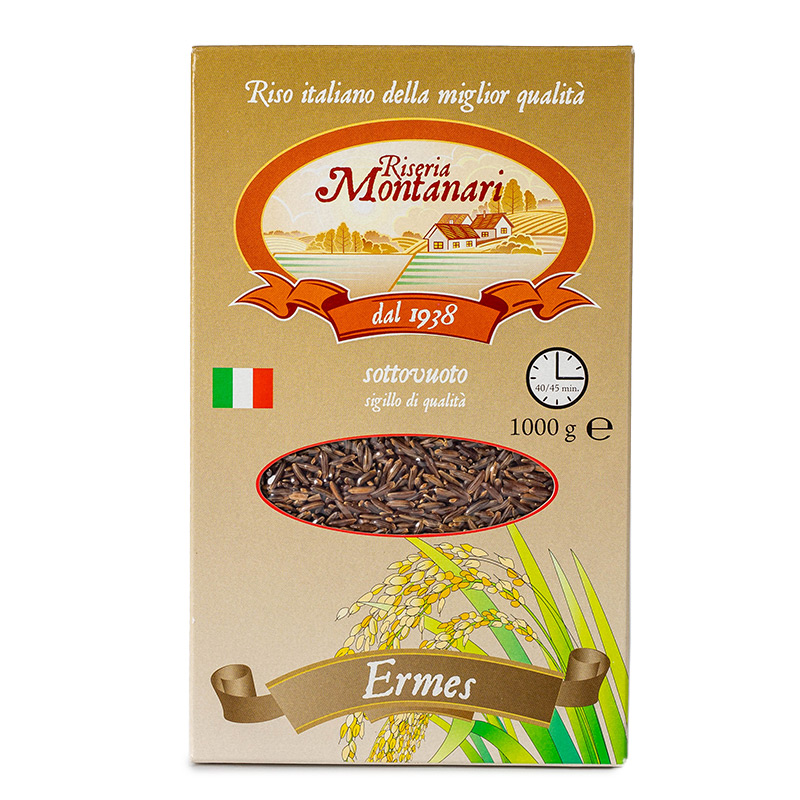 Červenohnedá talianska ryža ERMES ROSSO od Riseria Montanari je ryža s predlženým a chrumkavým zrnom. Pochádza z kríženia ryže Nero Venere a dlhozrnnej ryže. Táto ryža je tiež bohatá na vitamíny, minerály a bielkoviny, ktoré sú prospešné pre zdravú a správnu výživu.