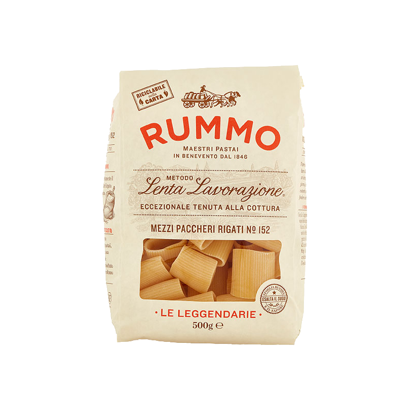 Rummo je renomovaný taliansky výrobca cestovín s dlhoročnou tradíciou, ktorý je známy svojou technológiou pomalého spracovania „Lenta Lavorazione“. Tá zabezpečuje, že cestoviny majú stabilnú kvalitu, výbornú textúru a spoľahlivý výsledok pri varení. Mezzi Paccheri Rigati sú ideálnou voľbou pre tých, ktorí hľadajú cestoviny s výraznou štruktúrou a schopnosťou dokonale pracovať s omáčkou.