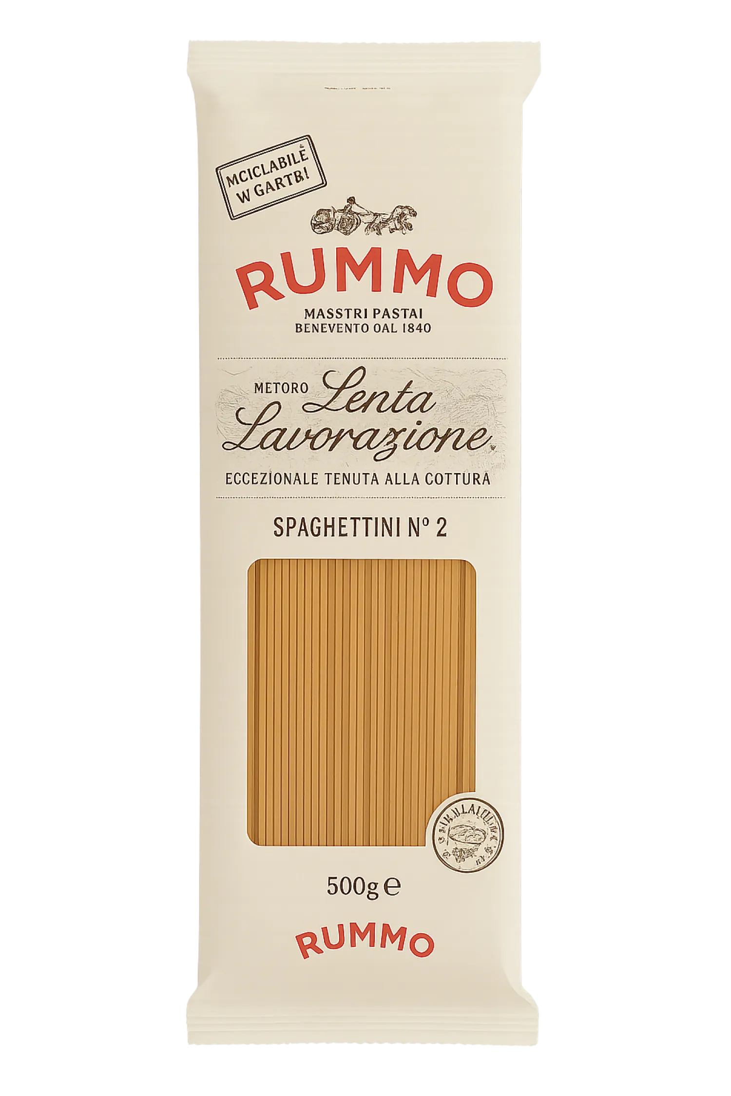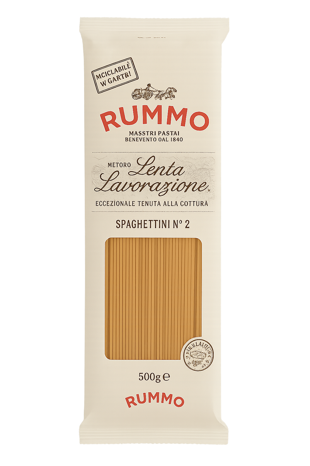 Rummo Spaghettini sú prémiové talianske cestoviny vyrobené z tvrdej pšenice semolina di grano duro, charakteristické svojou tenkou formou a výnimočnou schopnosťou zachovať si tvar aj po uvarení. Vyrábajú sa tradičnou metódou Lenta Lavorazione® – pomalým spracovaním cesta, ktoré mu dodáva pružnosť, jemne drsný povrch a výbornú schopnosť viazať omáčku. Vďaka tomu majú Spaghettini od Rummo autentickú chuť, pevnú konzistenciu „al dente“ a výnimočnú kvalitu, ktorú ocenia aj profesionálni šéfkuchári.