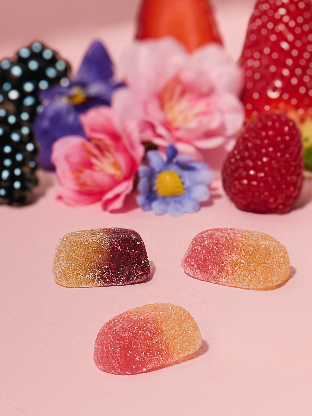 Zloženie: cukor, glukózový sirup, voda, jahodový nektár 2% (jahodové pyré 1%, voda, cukor), nektár z černíc 2% (ostružinové pyré 1%, voda, cukor), okysľovadlo (kyselina citrónová), extrakt z ruže 0,4%, želírujúca látka (pektín), extrakt z fialky 0,3%, prírodné arómy, koncentrát z čiernej mrkvy, regulátor kyslosti (citrát sodný), koncentrát šťavy z čiernej mrkvy. Neobsahujú živočíšnu želatínu.