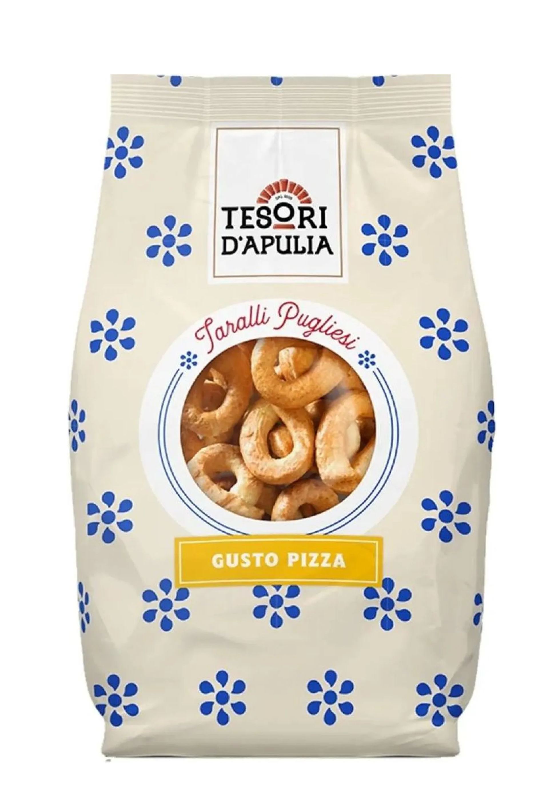 Tesori d’Apulia Pizzové Taralli sú chrumkavé tradičné talianske krúžky, ktoré prinášajú obľúbenú chuť pizze priamo na váš stôl. Značka Tesori d’Apulia, pochádzajúca z regiónu Apúlia, pripravuje taralli podľa osvedčených receptúr s použitím pšeničnej múky, olivového oleja a vína, ktoré v tomto variante dopĺňajú paradajky, oregano a aromatické koreniny. Výsledkom je snack s nezameniteľnou vôňou a chuťou, ktorá pripomína pravú taliansku pizzu.