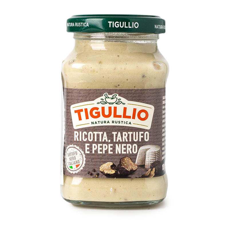 Omáčka Tigullio Ricotta, Tartufo e Pepe Nero predstavuje spojenie delikátnej ricotty s intenzitou talianskej čiernej hľuzovky umocnenej pikantným nádychom čierneho korenia. Omáčka predstavuje skutočnú špecialitu na zvýraznenie chuti vašich jedál. Pre intenzívnu chuť omáčky, pridajte trochu soli do vody na varenie cestovín a pomocou lyžice rozrieďte každú porciu omáčky predtým, ako ju primiešate do cestovín.