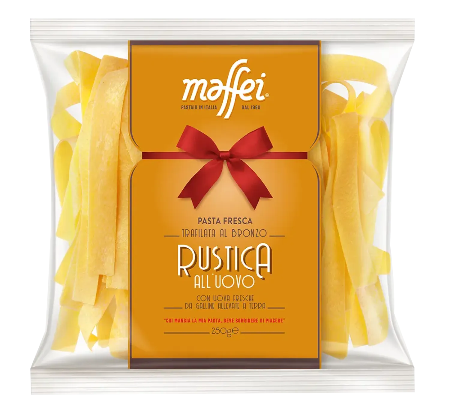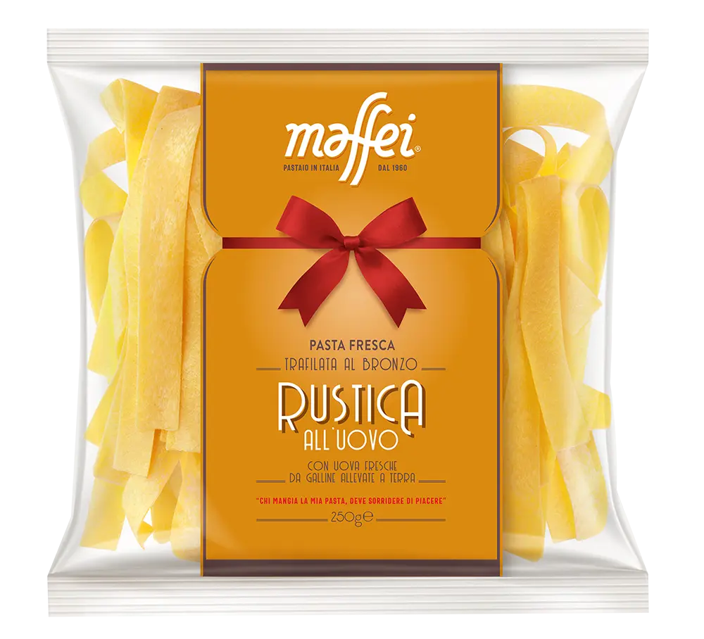 Značka Maffei patrí medzi najuznávanejších talianskych výrobcov čerstvých cestovín. Vyznačuje sa remeselným spracovaním, dôrazom na kvalitu a použitím surovín výhradne talianskeho pôvodu. Cestoviny sa vyrábajú pomalým procesom pri nízkych teplotách, vďaka čomu si zachovávajú prirodzenú vôňu, farbu a textúru. Pappardelle all’uovo od Maffei sú výbornou voľbou pre tých, ktorí hľadajú pravú taliansku chuť – poctivú, jednoduchú a bez kompromisov v kvalite.