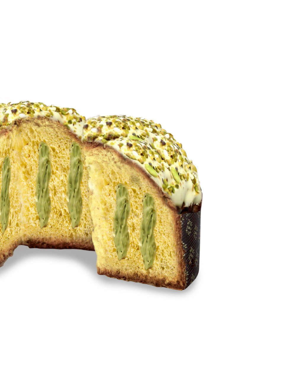 Zloženie: pšeničná múka, pistáciový krém 14 % (glukózový sirup, cukor, voda, pistáciová pasta 8 %, sušené odstredené mlieko, slnečnicový olej, vaječný žĺtok, arómy, zahusťovadlo: pektín; konzervant: sorban draselný; farbivo: koncentrát z mrkvy, tekvice a spiruliny), cukor, voda, maslo (mlieko), mliečna poleva 6 % (cukor, hydrogenované rastlinné tuky (palmové jadro, kokos), sušené odstredené mlieko, laktóza, emulgátor: sójový lecitín; arómy), kváskové cesto (pšenica) 6 %, vaječné žĺtky z talianskych podstielkových vajec, talianske podstielkové vajcia, lupienky bielej čokolády 2 % (cukor, sušené plnotučné mlieko, kakaové maslo, emulgátor: sójový lecitín; arómy), kúsky pistácií 2 %, emulgátory: mono- a diglyceridy mastných kyselín, med Millefiori, talianske čerstvé plnotučné mlieko, sladová pšeničná múka, soľ, prírodné arómy.